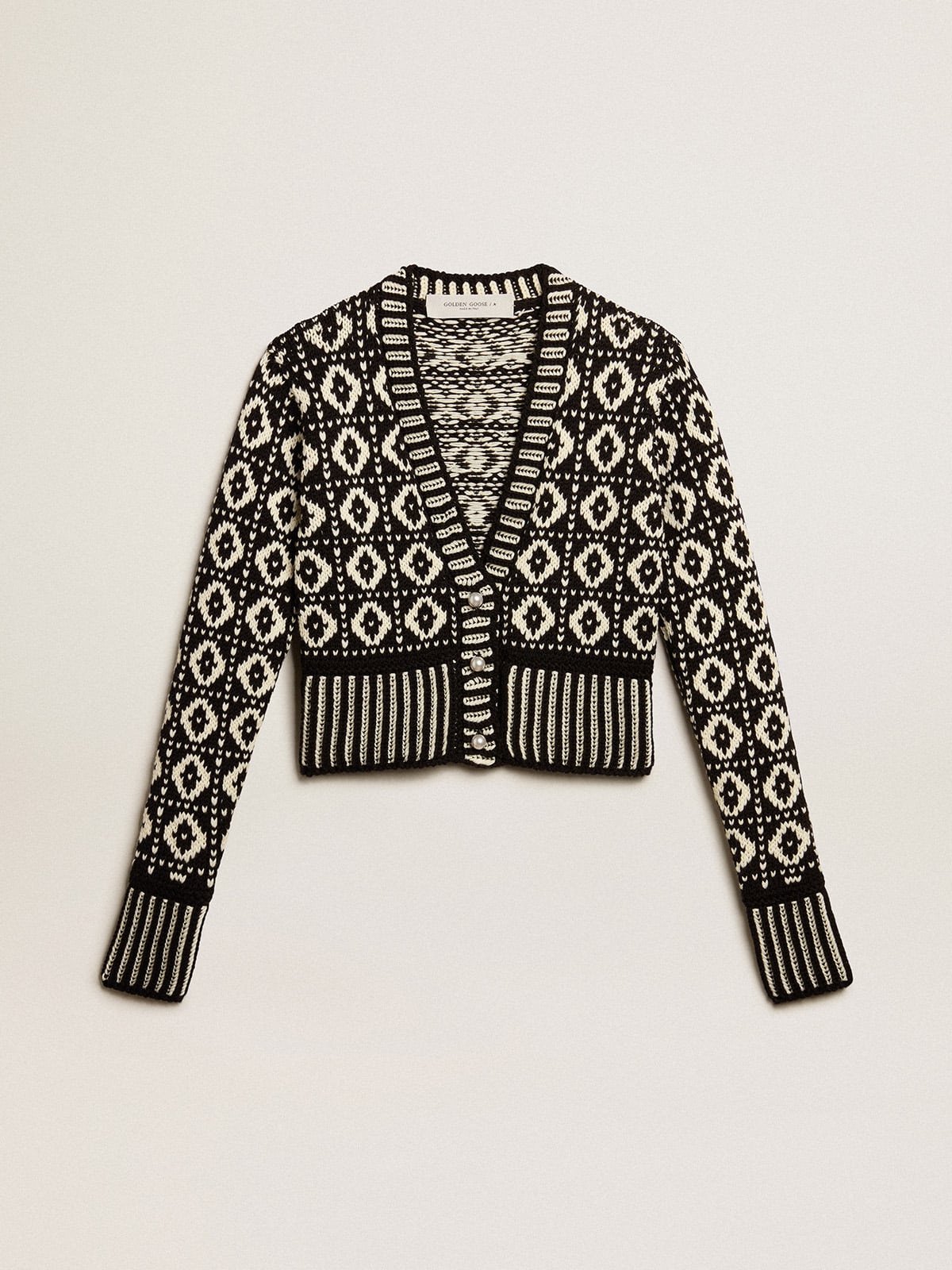 Short cardigan with geometric patterns in old and black white, perfect for autumn and winter. Made with high quality materials and casual but elegant design, this Golden Goose garment is perfect to complete your look in a refined and fashionable way. Size available: S. Give a touch of class to your wardrobe with this versatile and fashionable cardigan.