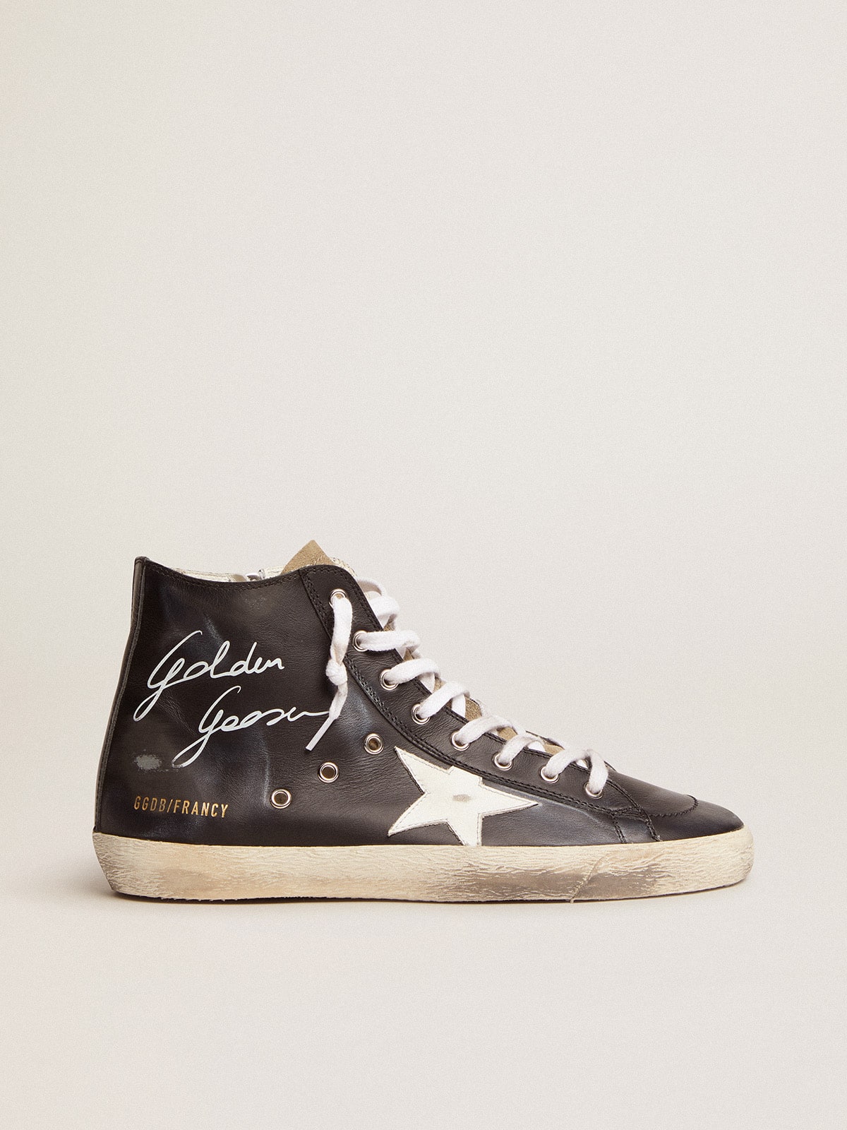 Golden Goose Francy men's shoe with black leather upper and white leather star, perfect for a casual and elegant look. Size 42, ideal for the Autumn/Winter season thanks to multicoloured colors. A high quality product suitable for every occasion.