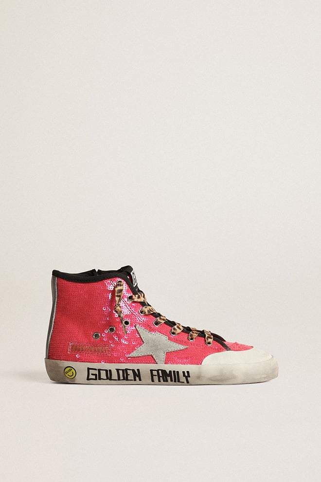 Golden Goose Francy Penstar Young sneakers in fluo pink are perfect for a casual and elegant look during autumn and winter. Decorated with sequins and handwritten on the sole, these sneakers will give a unique touch of style to your outfit. Available in size 33, they are a must-have for your shoe collection.