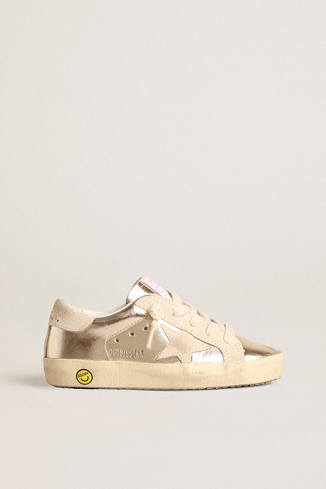 Golden Goose Super Star Young Leather Laminated Platinum With Star And Talloncino In Suede, Size: 29