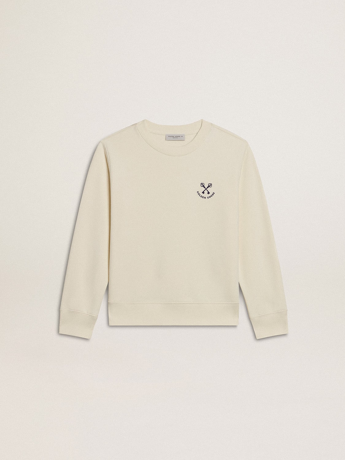 White men's t-shirt from the Golden Goose brand, suitable for all seasons. It features an embroidery on the front and a print on the back. Available in size 10. Perfect for a casual and fashionable look.