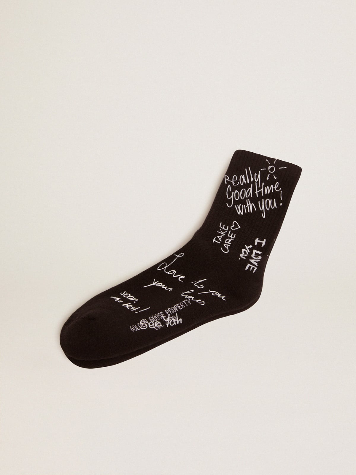 Black socks with white lettering Golden Statement, ideal for a casual and elegant look in autumn/winter. Made of soft multi fabric with irresistible details. Available in size L for perfect comfort. Add a touch of style to your everyday outfits with these fashionable socks.