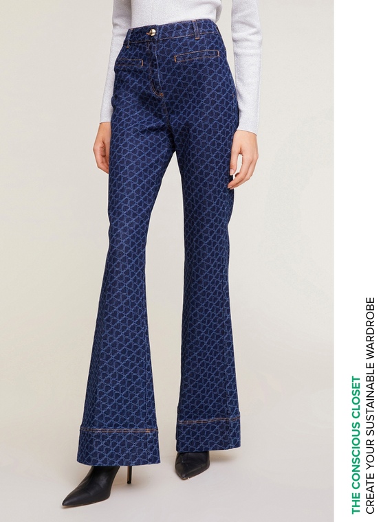 High waist flare jeans with "Double Love" pattern, suitable for both men and women. The blue color makes it perfect for wearing in all seasons. Made of durable and comfortable fabric, this casual garment is ideal for creating original and fashionable outfits. To match with a t-shirt or a shirt for a trendy and versatile look.