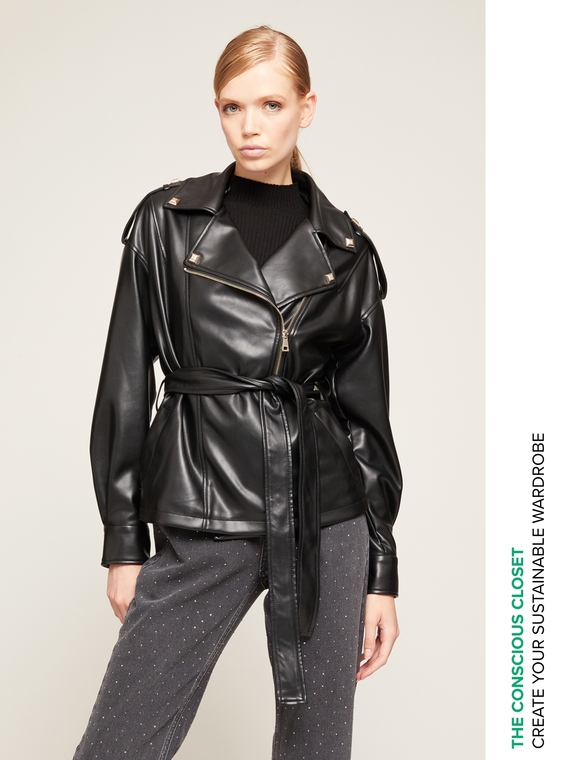 Black nail jacket with belt for women, size 42. Ideal for spring, fits perfectly to a sports or casual look. Made with high quality materials and refined details, it is a versatile and fashionable garment for every occasion. Comfortable to wear and easy to pair with jeans or elegant pants.