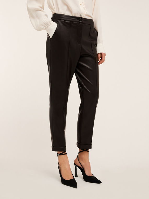 Trousers in brown coated fabric, perfect for a casual and trendy look during autumn and winter. Available in XS size, they are comfortable and versatile to create fashionable and comfortable outfits. Ideal to pair with sweaters and boots for a casual chic look.