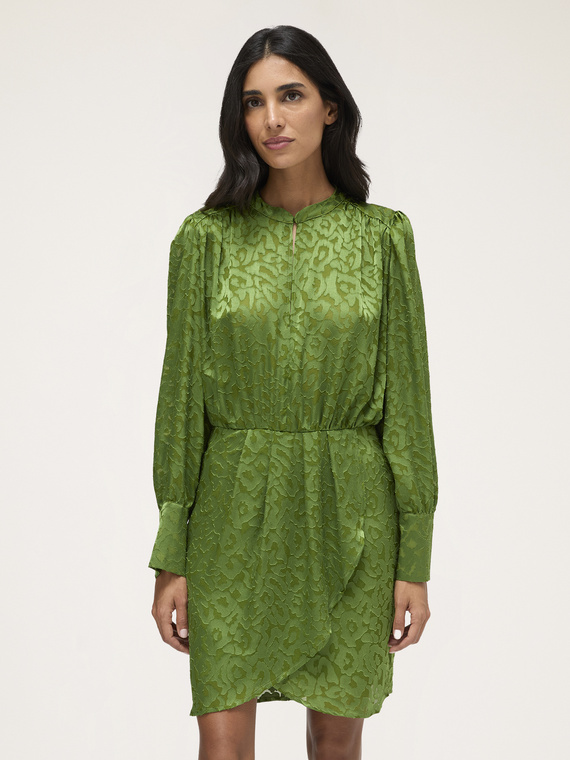 Mini green dress in Devoré satin with wallet effect, perfect for an elegant look in any season. This size 36 woman's dress is ideal for special occasions and elegant evenings. The lightweight fabric and tight fit make it a versatile and sophisticated garment to wear with sandals or décolleté. Complete your outfit with minimalist accessories and an elegant clutch for an impeccable look.