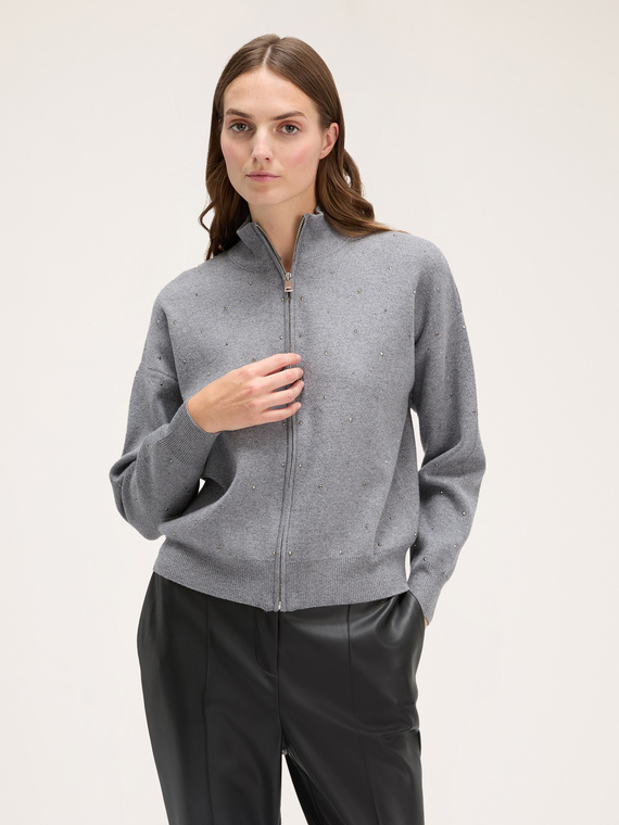 Knit sweatshirt with crystals for women, perfect for a casual look in autumn/winter. The gray color is easily matched to any outfit. Made with high quality materials, it will be comfortable to wear throughout the day. Add a touch of elegance to your wardrobe with this trendy sweatshirt.