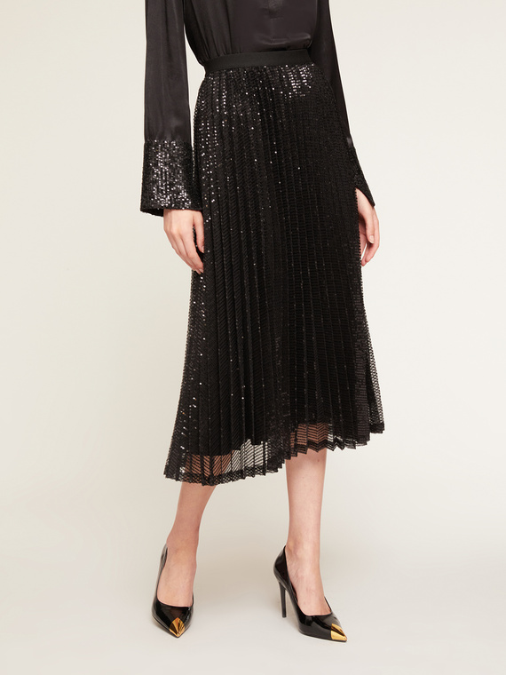 Gonna midi plissé with sequins, ideal for spring. Made of light black fabric and comfortable to wear. Perfect to wear on sports or casual occasions. XS size suitable for women.