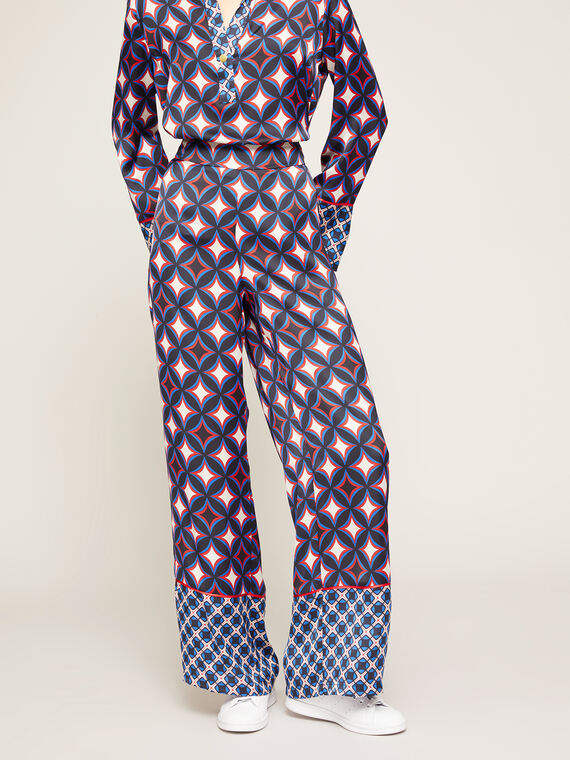 Palace pants in satin with geometric pattern ideal for autumn/winter. The blue color adds a touch of elegance to your casual look. The wide cut and soft texture ensure comfort and style. A versatile garment to match with sweaters and low shoes for a fashionable outfit.