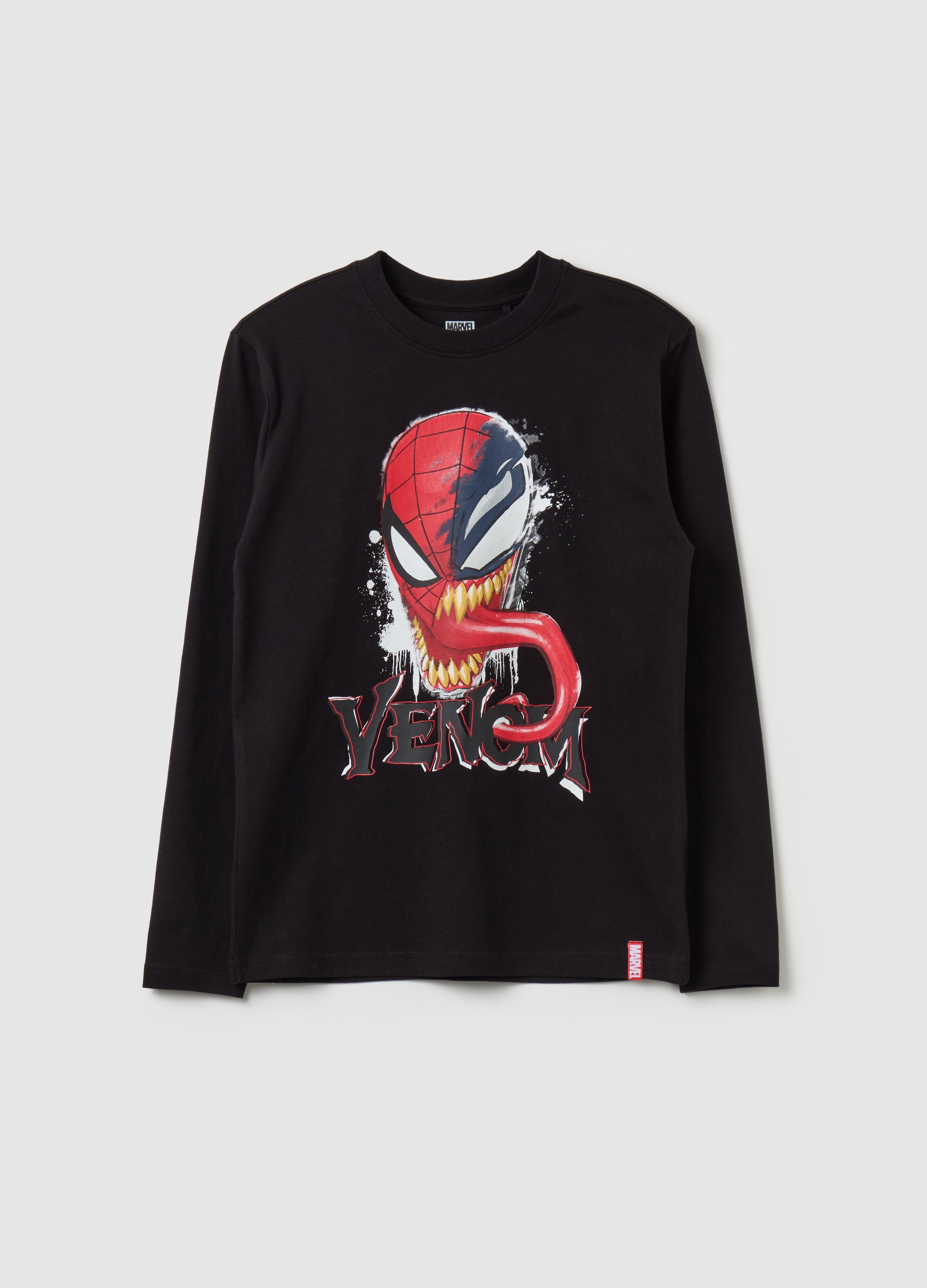 Black long sleeve casual t-shirt with Venom print for man. Perfect for all seasons, to wear with jeans or casual pants for a trendy and comfortable look. Made of soft and light fabric, ideal for leisure and informal occasions. A garment that cannot fail in the wardrobe of every fashionable man.