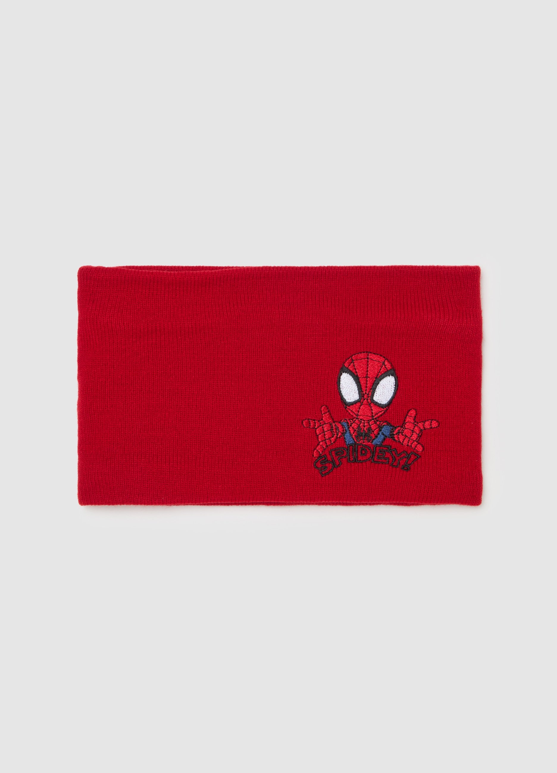 Red knitted scarf with Spiderman embroidery for men. Ideal for winter, it will keep you warm with style and grit. Perfect for a casual and fun look. Suitable for every occasion, both in the city and for a walk outside door.