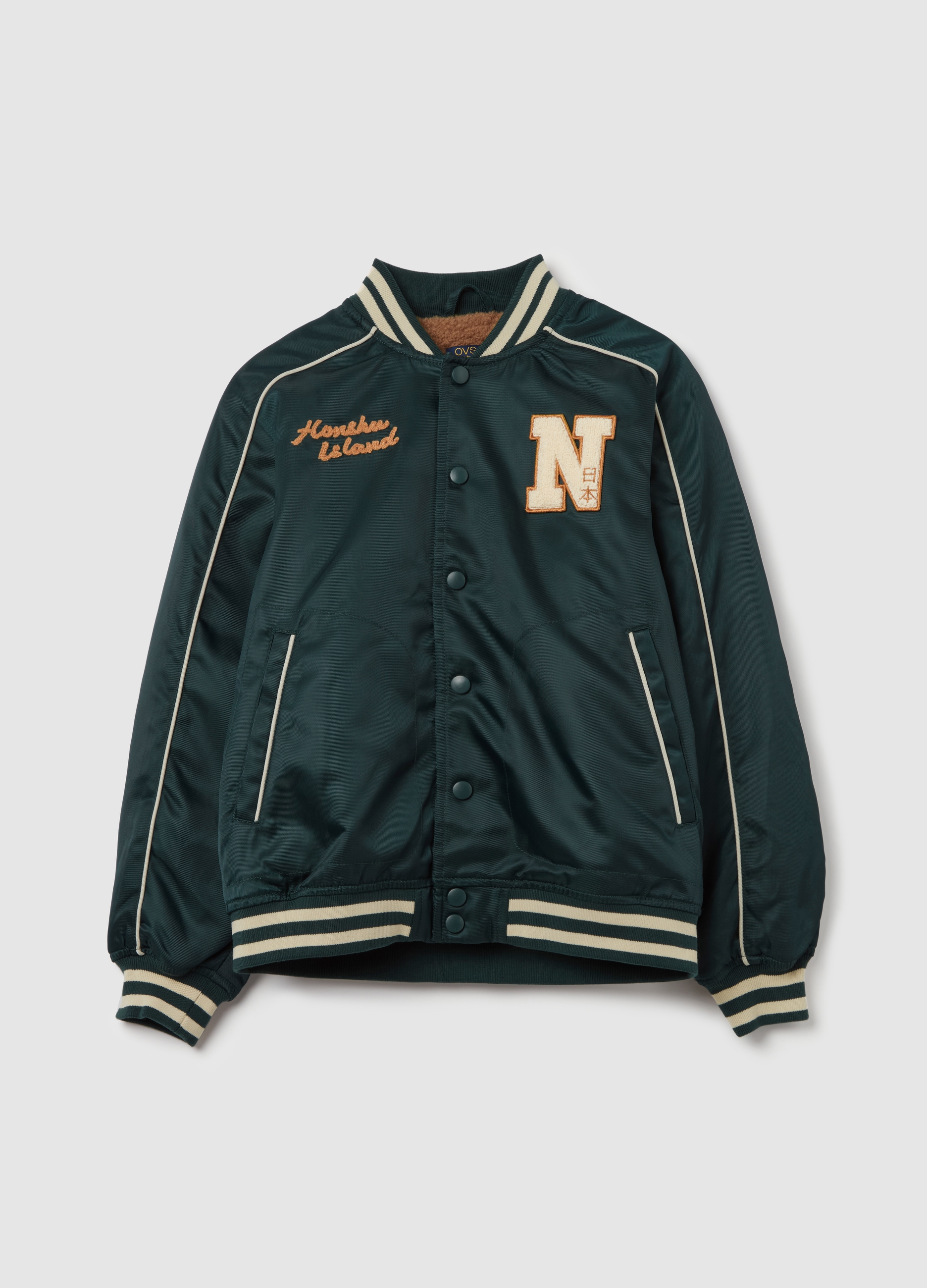 Varsity jacket with inner sherpa for man, ideal for spring and autumn. The green color makes it suitable for any casual or elegant outfit. Made of durable and comfortable fabric, perfect for facing the coolest days with style. A versatile and trendy garment to complete your look.