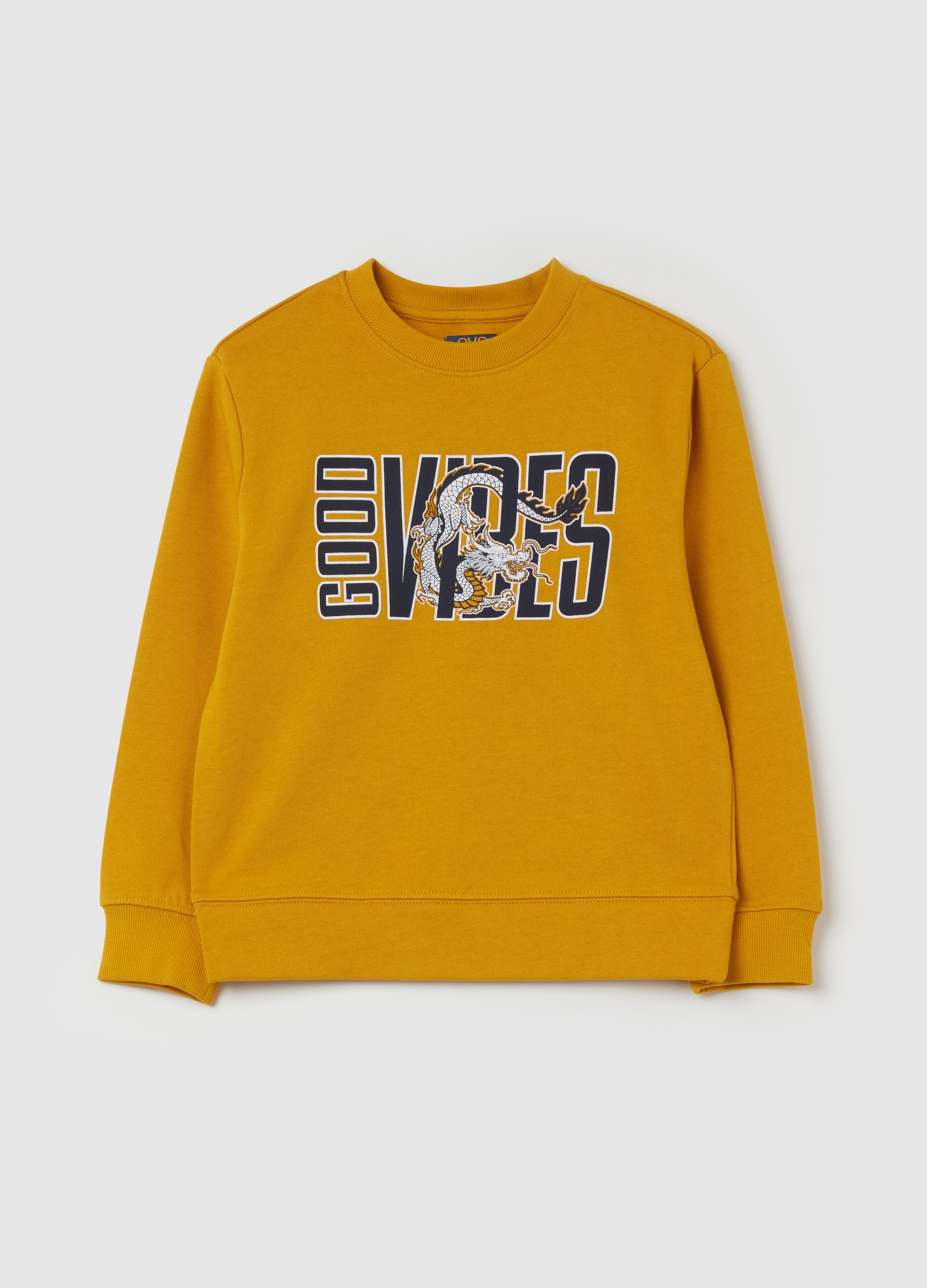 Yellow cotton sweatshirt with lettering and dragon print, ideal for autumn/winter season. This casual men's sweatshirt is perfect for a fashionable and comfortable look. Suitable for cooler days, this OVS sweatshirt is a must-have for the male wardrobe.