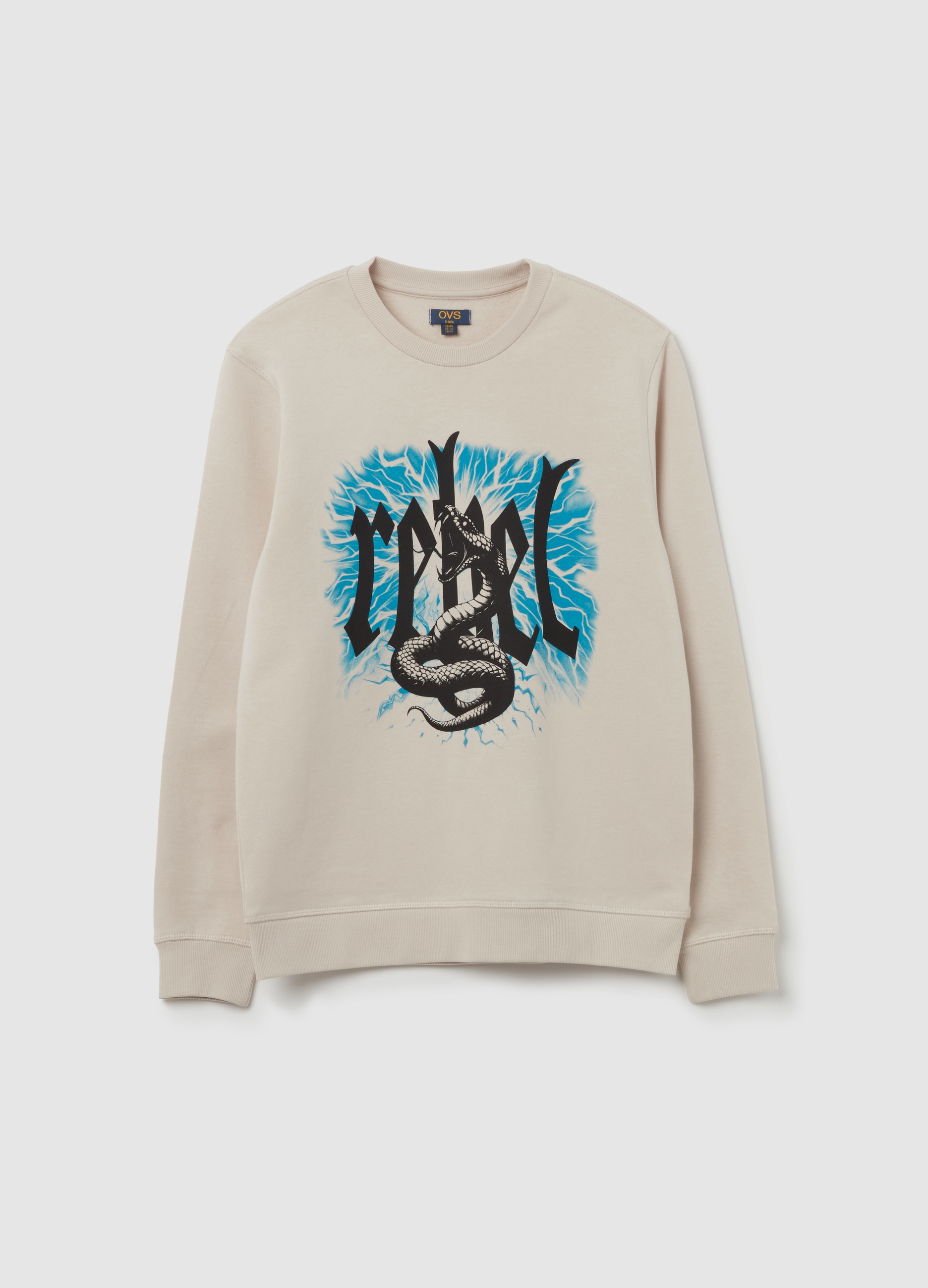 OVS Cotton Sweatshirt With Rebel Printing And Snake Man Beige