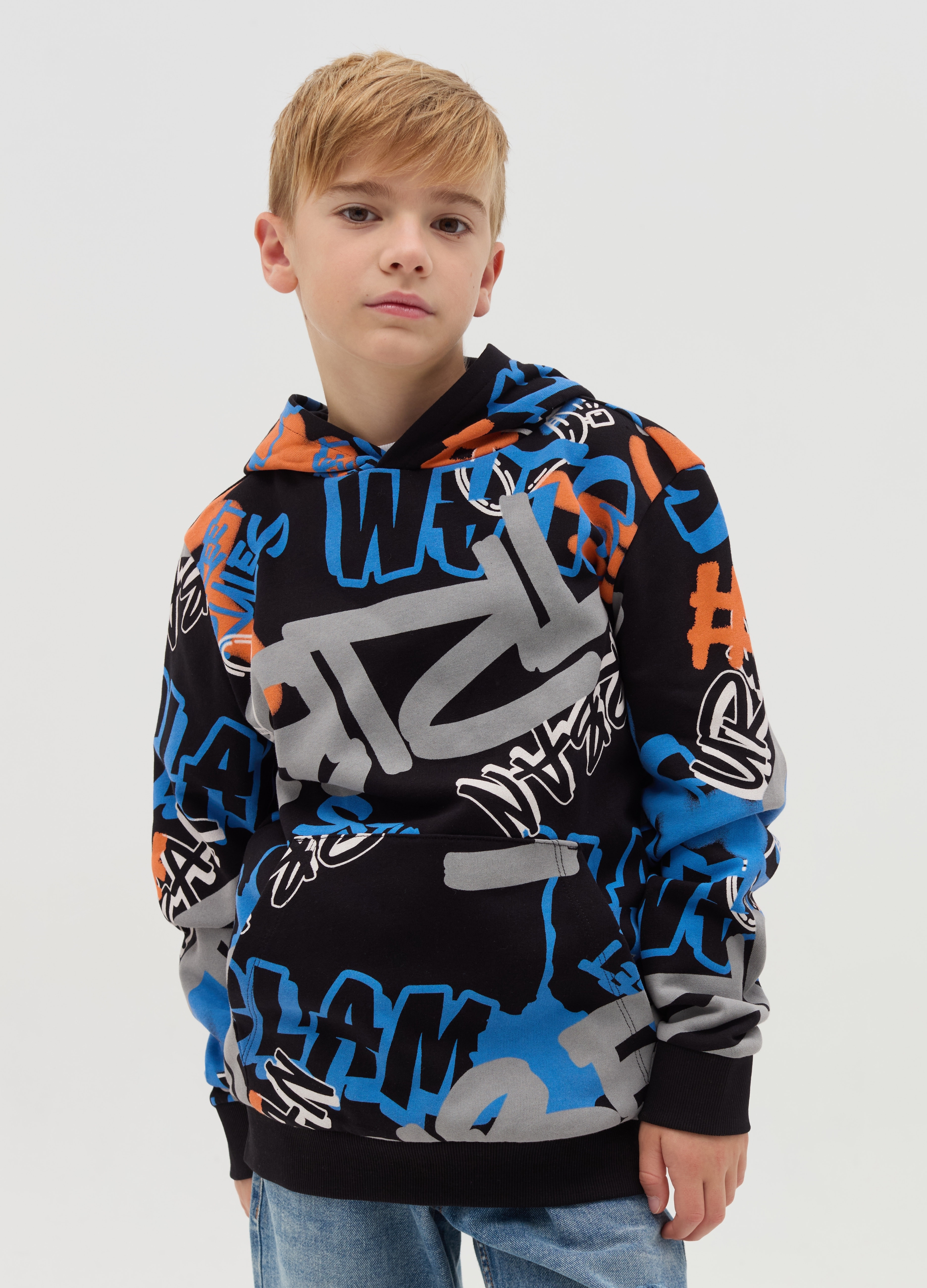French Terry sweatshirt with hood and print, perfect for autumn/winter. Black, ideal for casual and sporty look. Made of soft and comfortable fabric, it guarantees warmth and style. A versatile garment to complete your wardrobe in a trendy way.