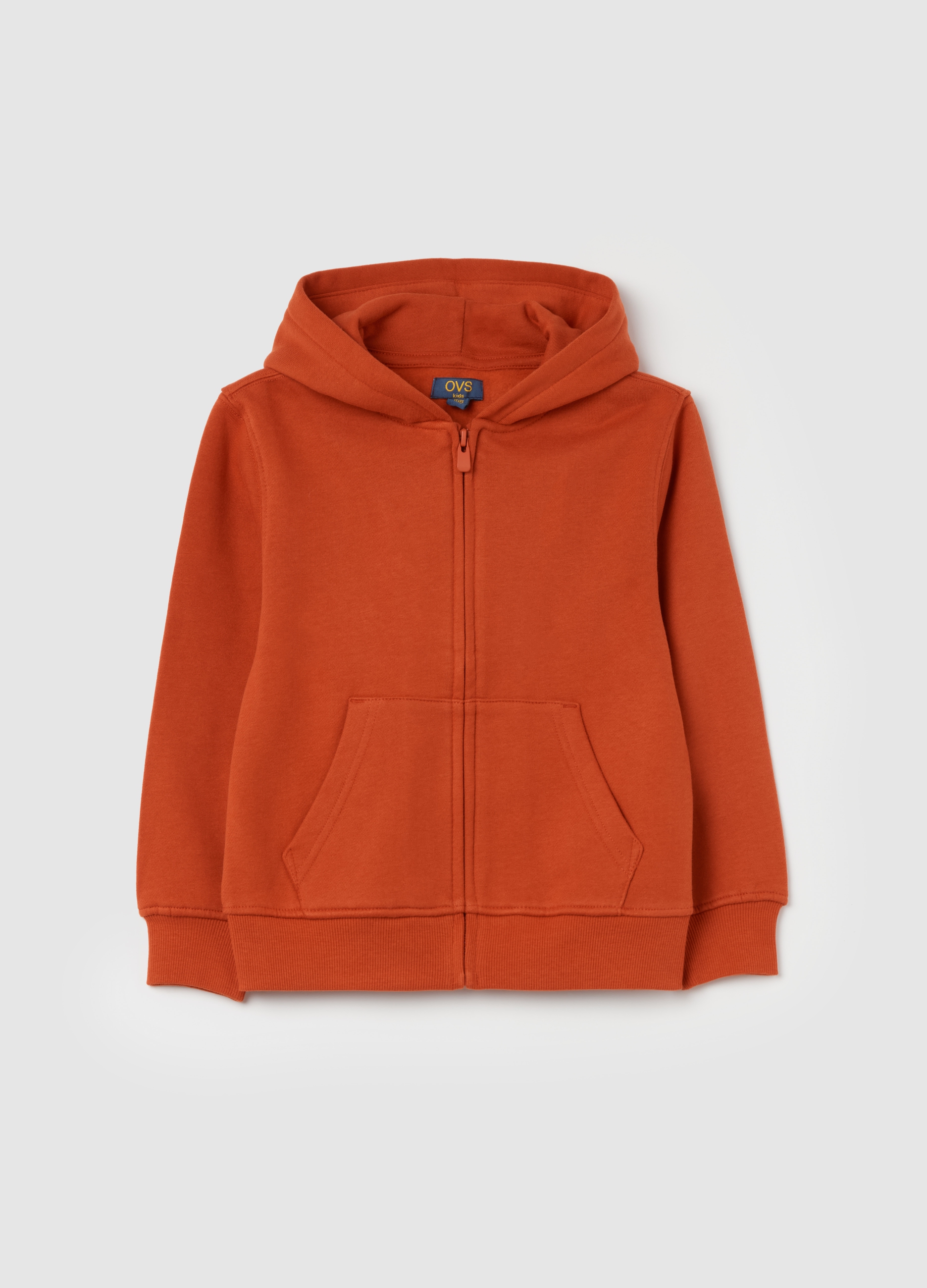 Men's Sweatshirt with full zip and hood, made of soft organic cotton. The orange color makes it perfect for autumn and winter. Ideal for a casual and comfortable look. Available in different sizes to fit each body.