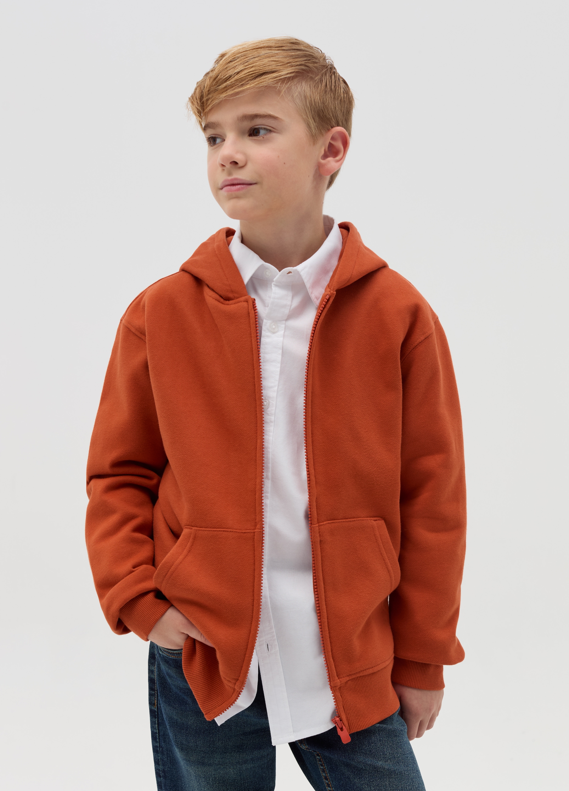 Men's Sweatshirt with hood and full zipper, perfect for autumn and winter. Made of soft sweaty orange fabric. Ideal for a casual and comfortable look, to match jeans or sports pants. An essential garment to face the coolest days with style.
