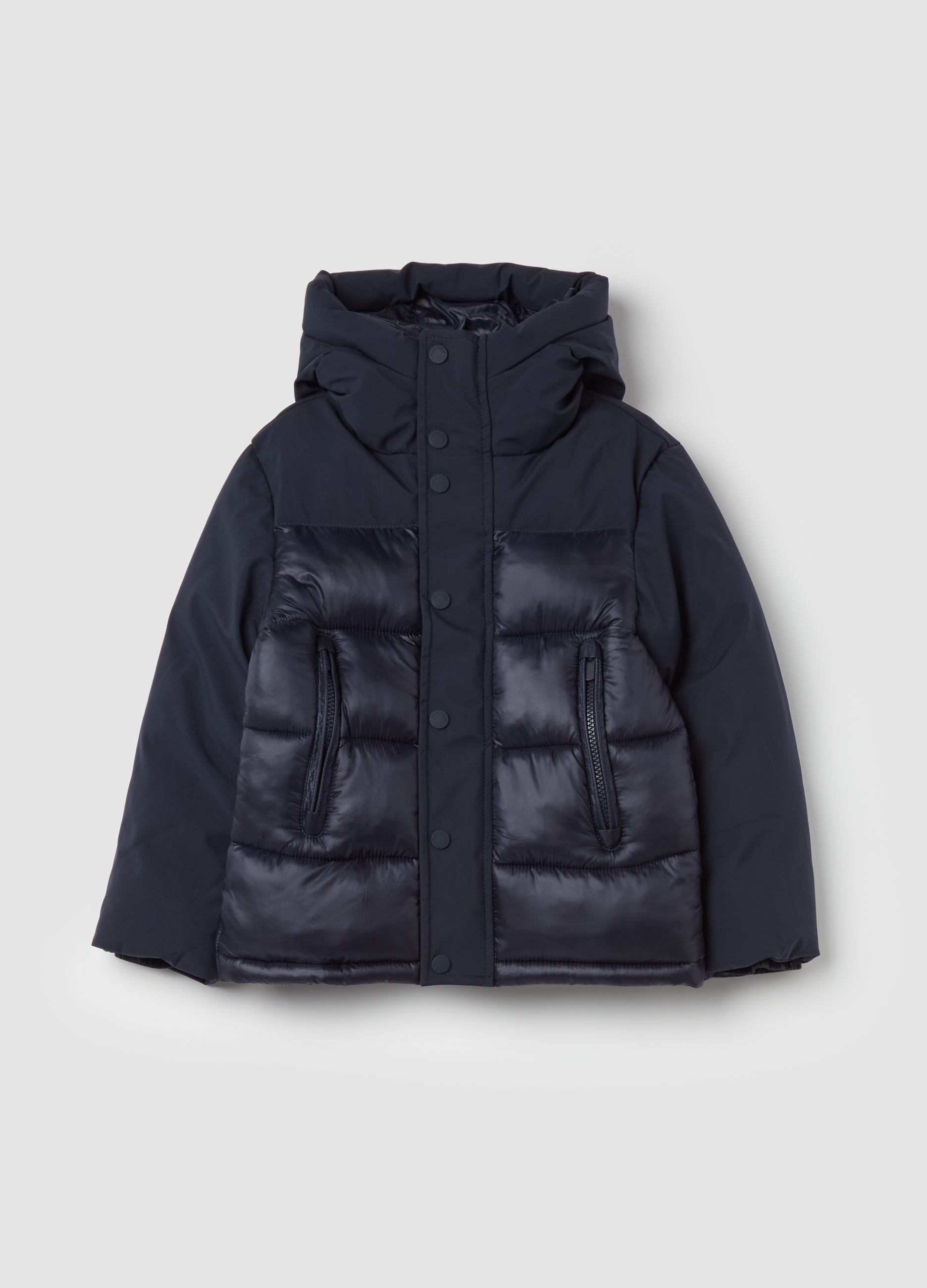 The High-necked down jacket with blue colored man hood is perfect for facing winter with style. Made of durable and warm fabric, this garment provides comfort and protection from atmospheric agents. The casual and elegant design makes it suitable for different occasions, from leisure to day in the city. A great choice to complete your winter look with class.