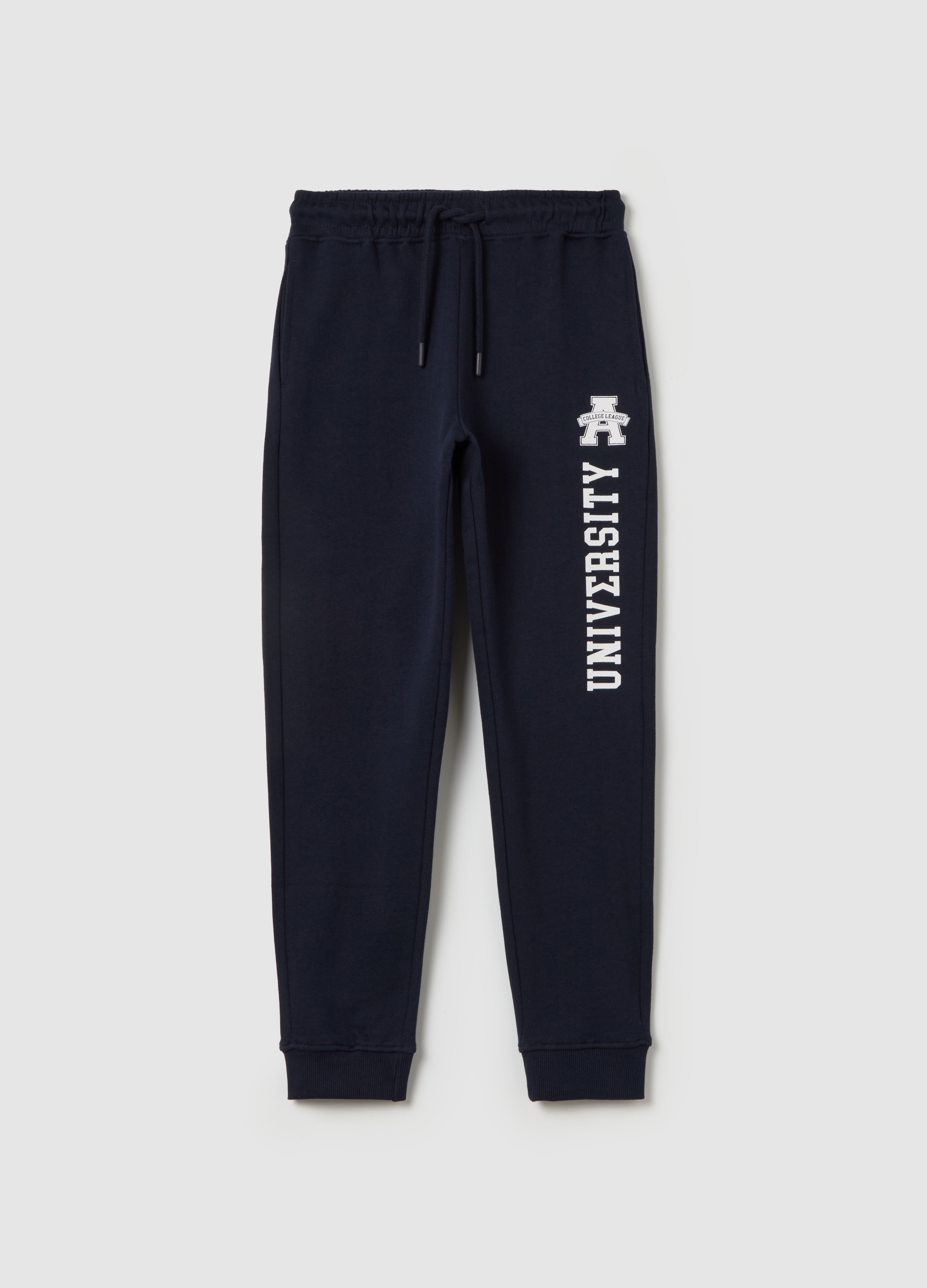 Men's casual blue joggers with coulisse and "university" print, perfect for autumn and winter. Made of soft and comfortable fabric, ideal for a sporty but fashionable look. Comfortable to wear for a casual and trendy look on every occasion. Find out how easy it is to match these joggers with your wardrobe!