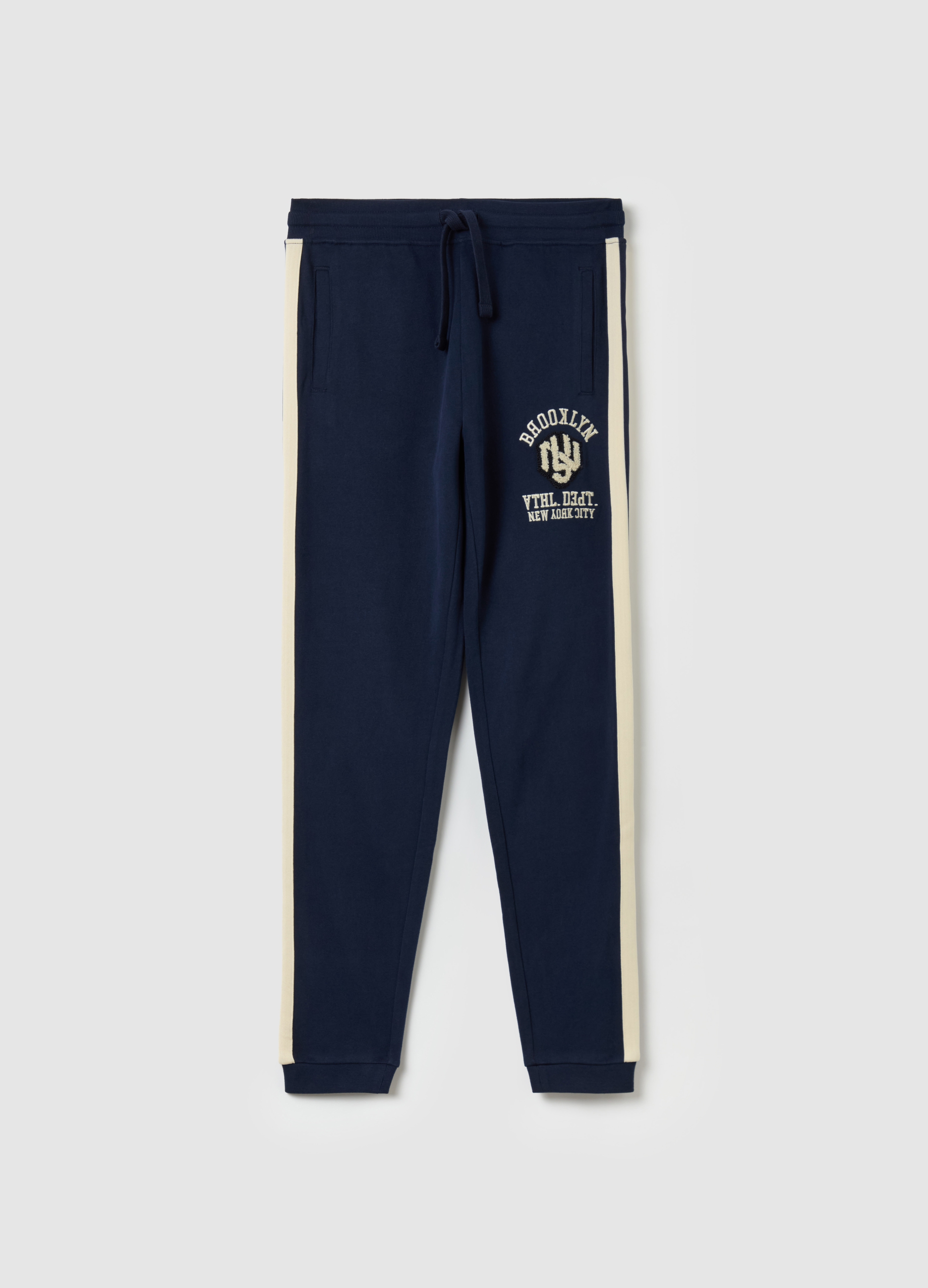 Men's casual pants, ideal for autumn and winter, blue. These joggers are decorated with embroidery and patch bouclé, for an extra touch of style. Made of high quality materials, they are comfortable and durable, perfect to match a sweatshirt or a shirt for a casual and fashionable look.