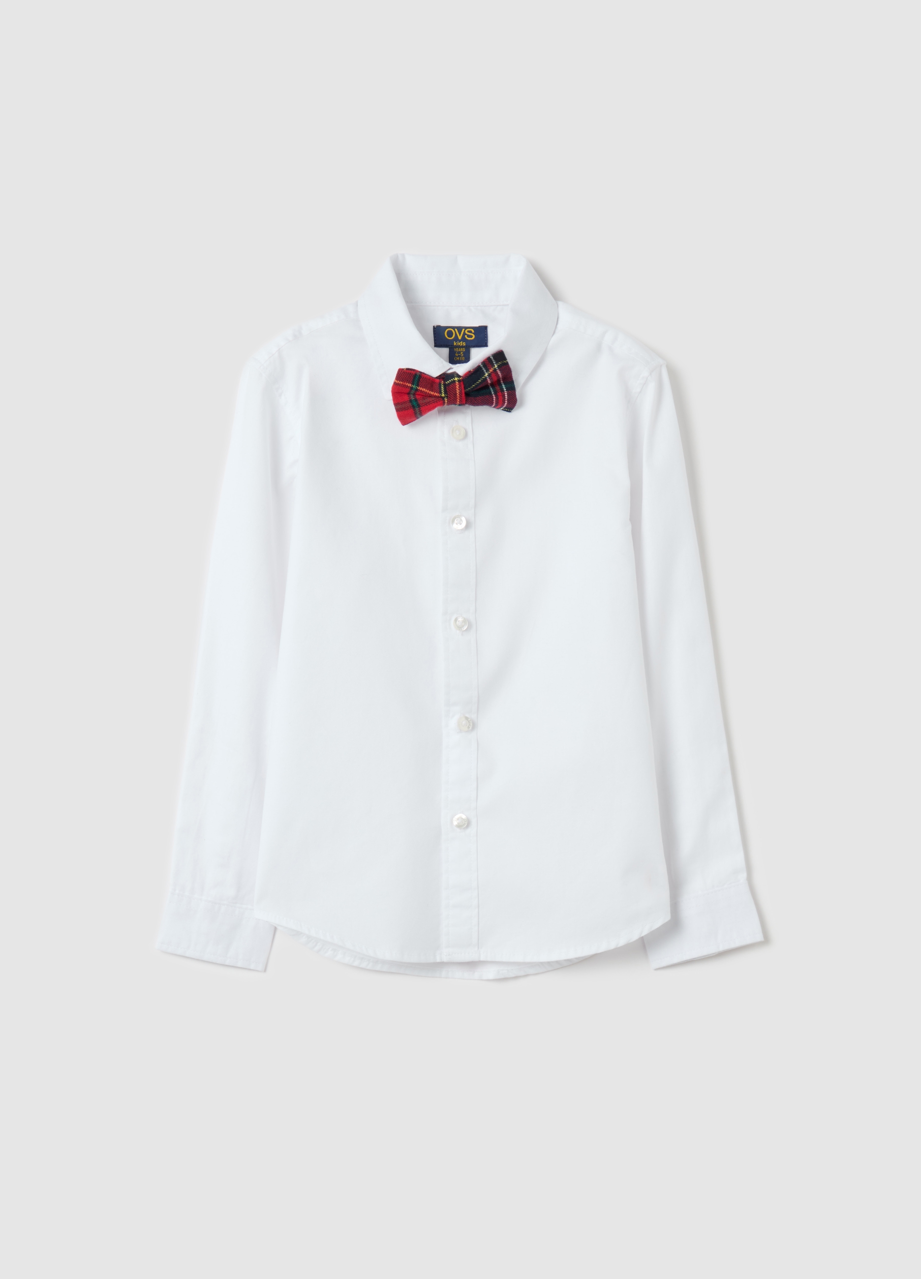 Men's casual shirt in light cotton, suitable for spring and autumn. The white color makes it versatile to match various outfits. The tartan printed bow tie adds a touch of elegance and originality to the look. Perfect for a casual but nice look.