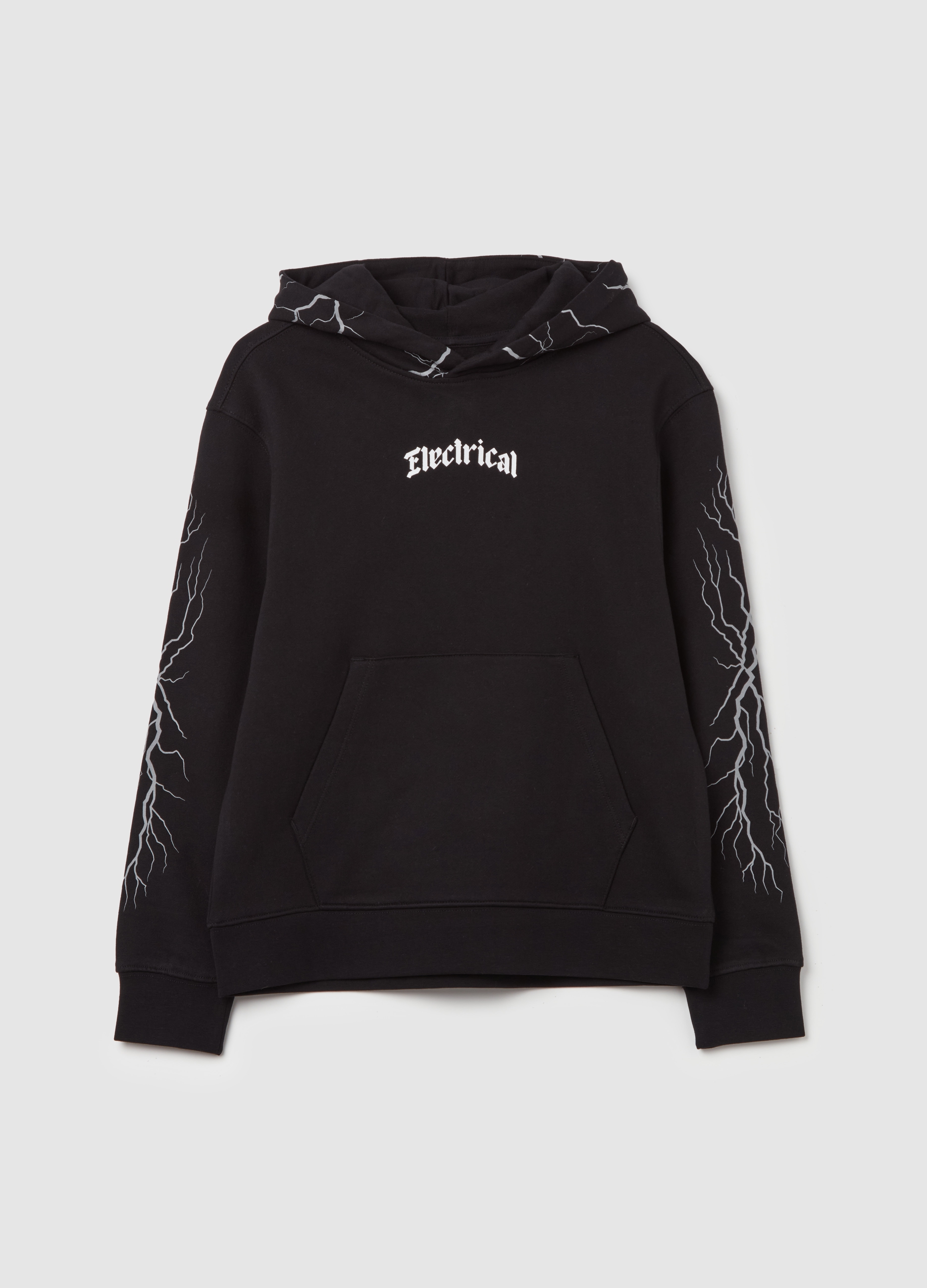 "Electrical" hoodie for man, perfect for autumn and winter. Black, suitable for a casual and trendy look. Made with high quality materials and comfortable to wear. Ideal for a fashionable and comfortable look during the cold season.