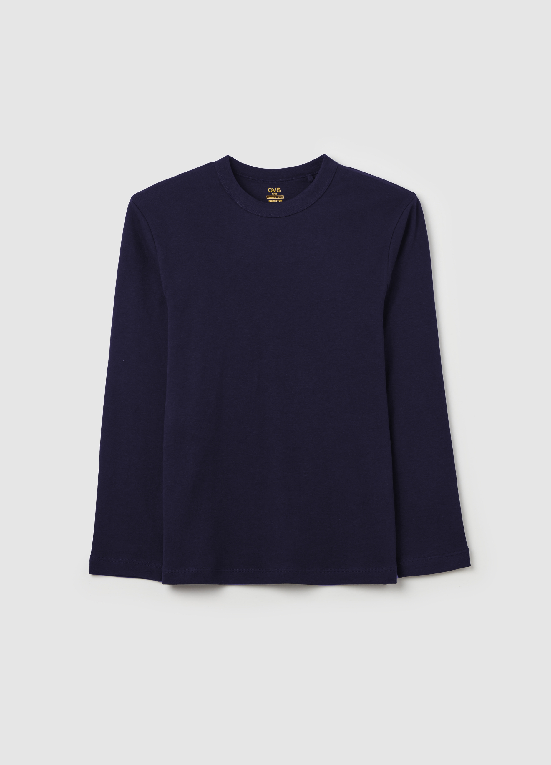 Essential T-shirt with long sleeves, made of soft blue organic cotton, perfect for every season. Ideal for a casual and comfortable look, to pair with trousers or jeans for a casual and trendy look. A versatile and quality garment, perfect for a man who loves to dress in style and attention to the environment.