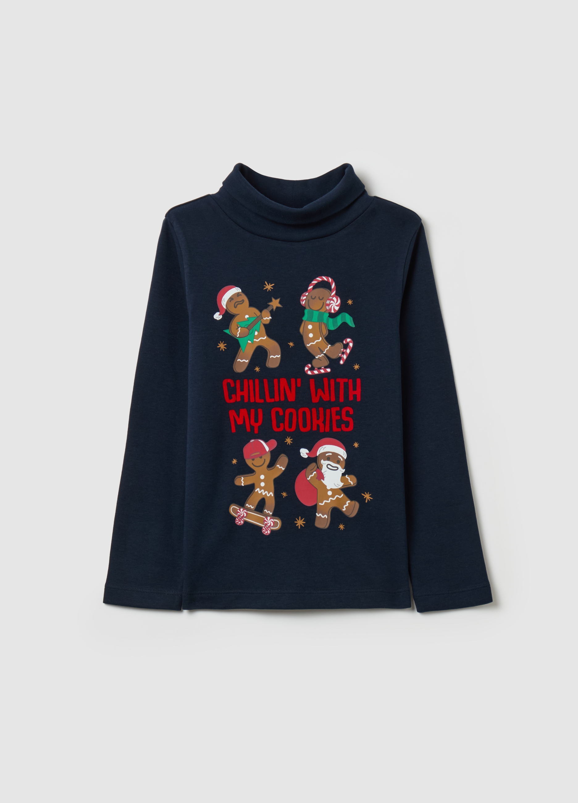 High neck casual t-shirt with "Chillin' With My Cookies" print for man, blue. Made of light and comfortable material, perfect for all seasons. A versatile and fashionable garment, ideal for a casual and informal look. Available in sizes 6 and 7.