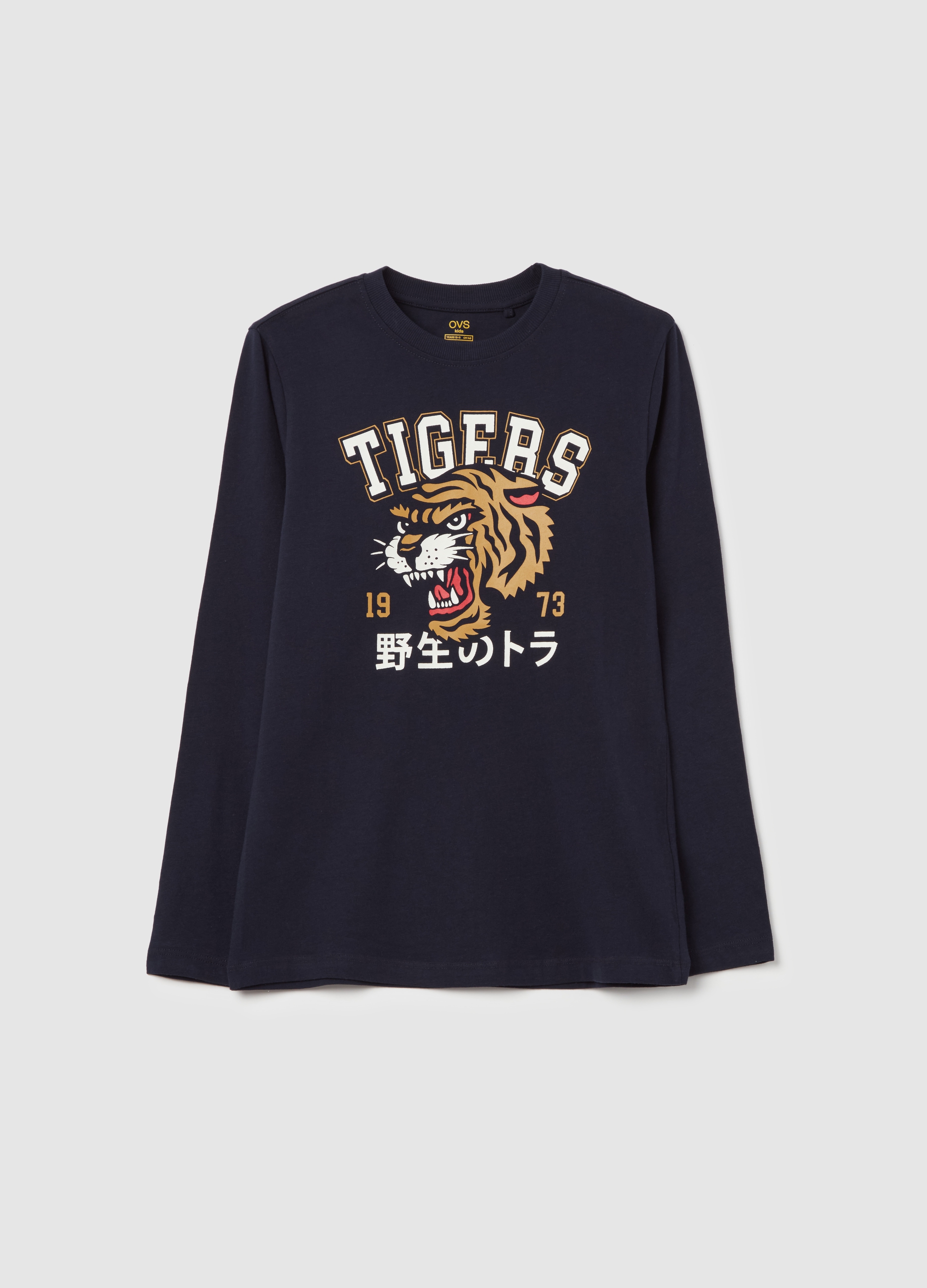 This casual t-shirt for man of blue color, design with tigers print of 1973, is perfect for every season. Made with long sleeves, it is available in sizes 11 and 12. Add a touch of style to your look with this comfortable and fashionable garment.