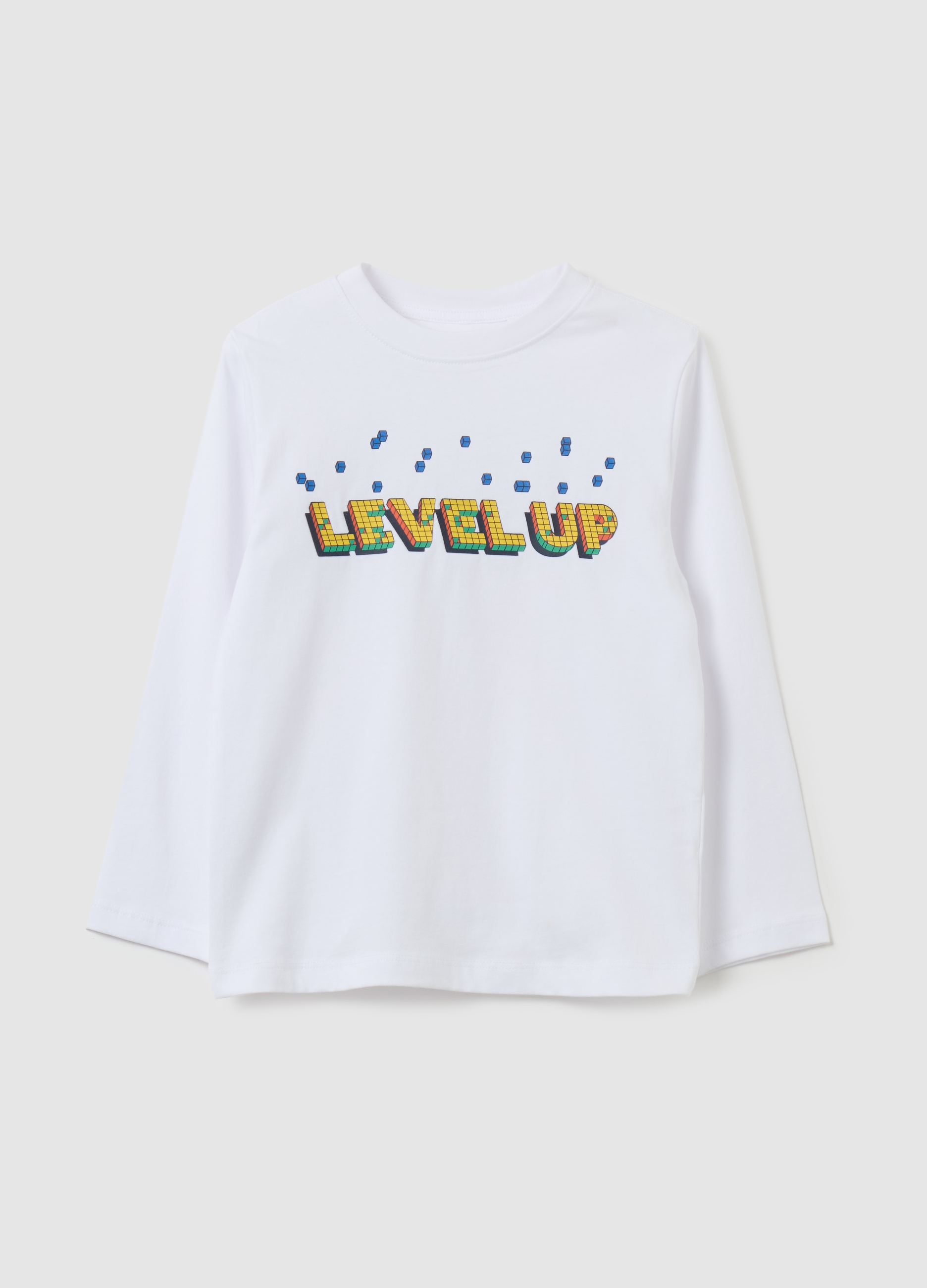Men's white t-shirt with long sleeves in cotton with print. Ideal for casual look and suitable for all seasons. Available in cutting 5 6 OVS. To pair with jeans or trousers and sneakers for a comfortable and trendy outfit.