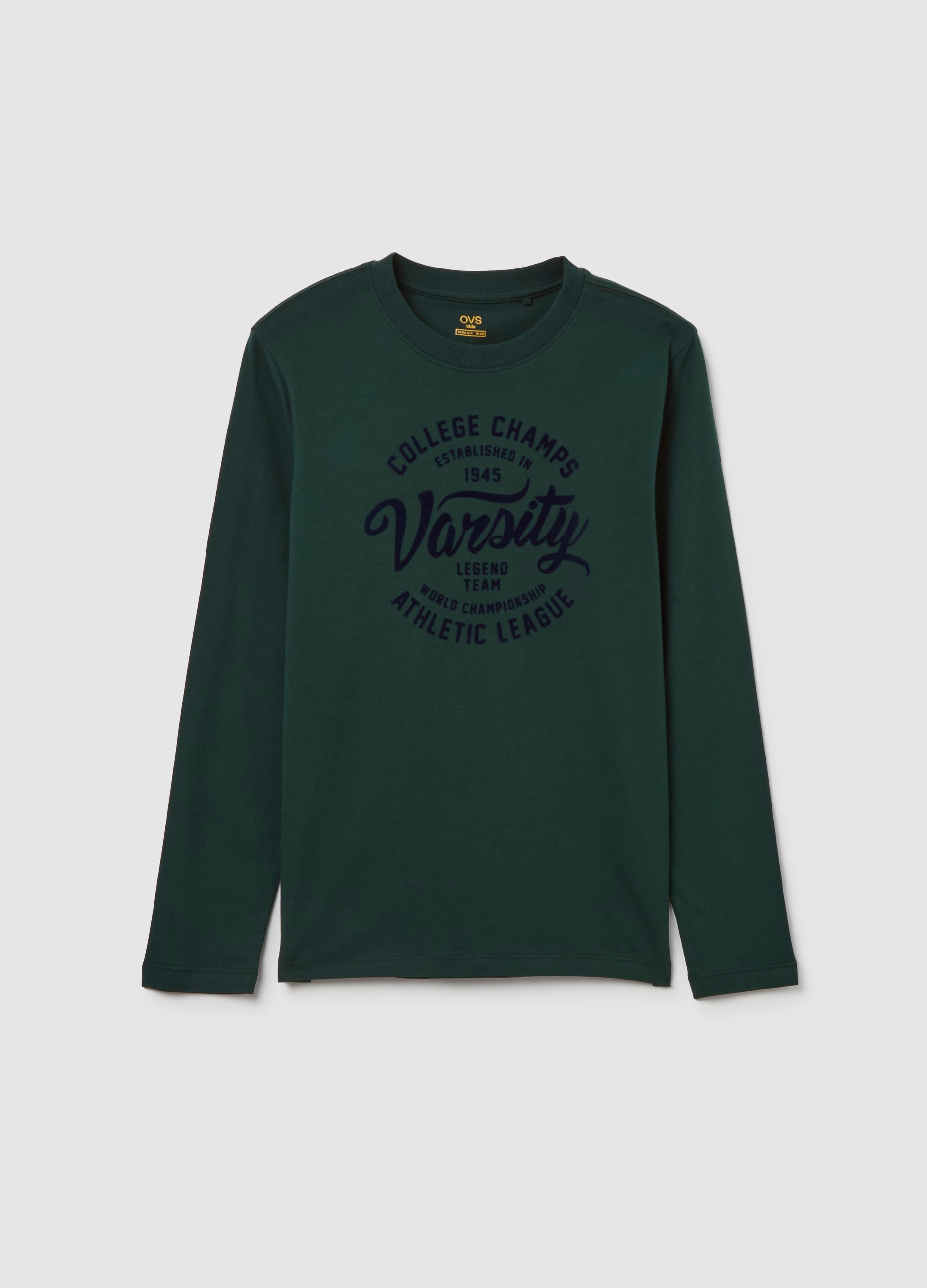 Men's casual long sleeve t-shirt with Varsity College print, perfect for every season. Made of soft green fabric, ideal to match with jeans or sports pants for a trendy and comfortable look. Complete with a classic cut and comfortable fit, it will be the perfect garment to wear during leisure or for an informal exit with friends. A must-have for every man's wardrobe looking for style and comfort.