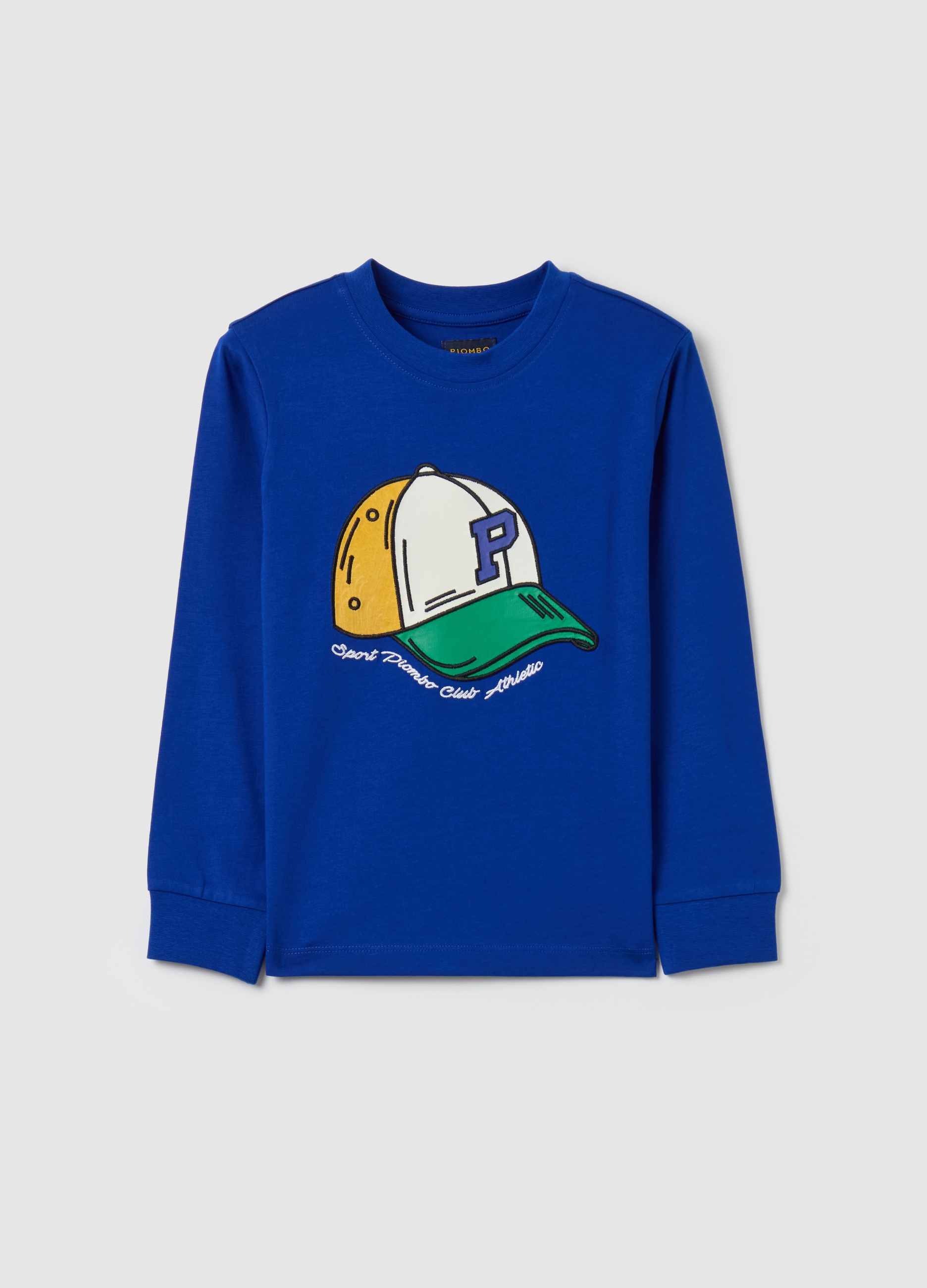 Blue casual t-shirt for man, ideal for every season. With cap embroidery and lettering on the chest, a touch of unique style. Made of soft cotton for lasting comfort. Perfect to match with jeans or casual pants.