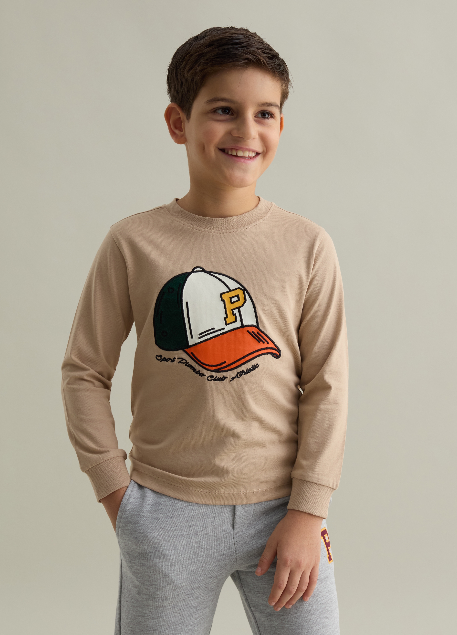 Men's casual t-shirt in beige color, suitable for all seasons. Presents a cap embroidery and lettering. Made with high quality materials for a trendy and comfortable look. Perfect to match with trousers or jeans for a casual and fashionable outfit.