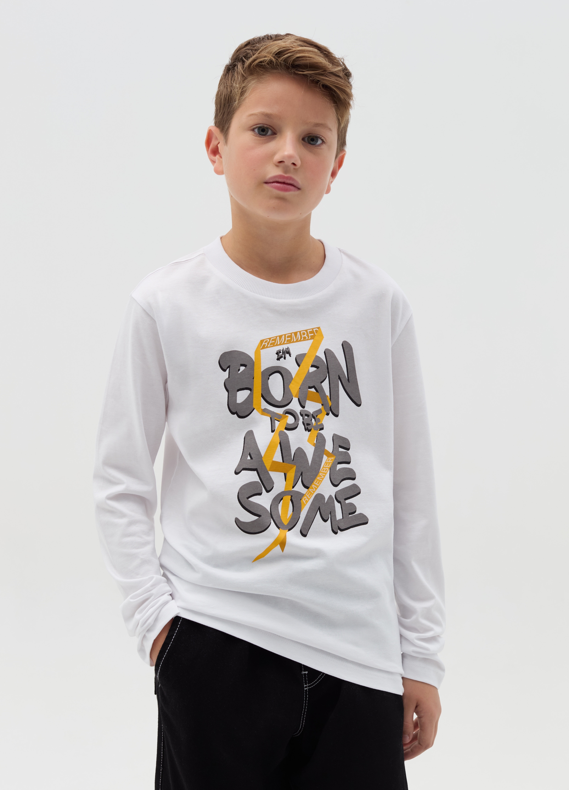T-shirt casual for man, white, suitable for all seasons. With print and long sleeves, ideal for a trendy and comfortable look. Comfortable to wear on any occasion, from leisure to city exits. Add a touch of style to your outfit with this OVS T-shirt.