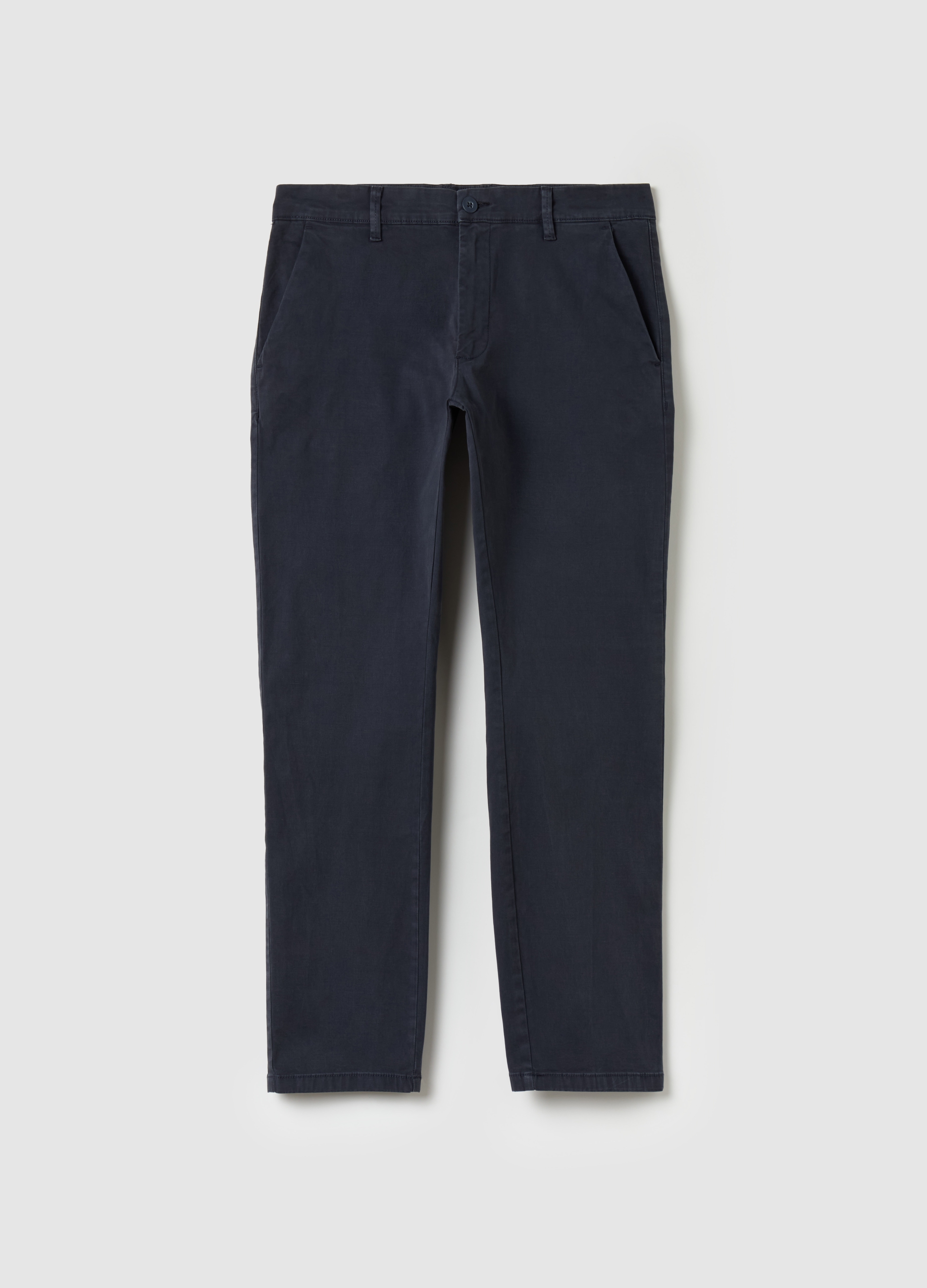Chino trousers in stretch cotton for men, perfect for a casual look in autumn/winter. Blue, with classic cut and comfortable to wear. Ideal to complete your daily outfit with style and practicality. A versatile and quality garment, suitable for many occasions.