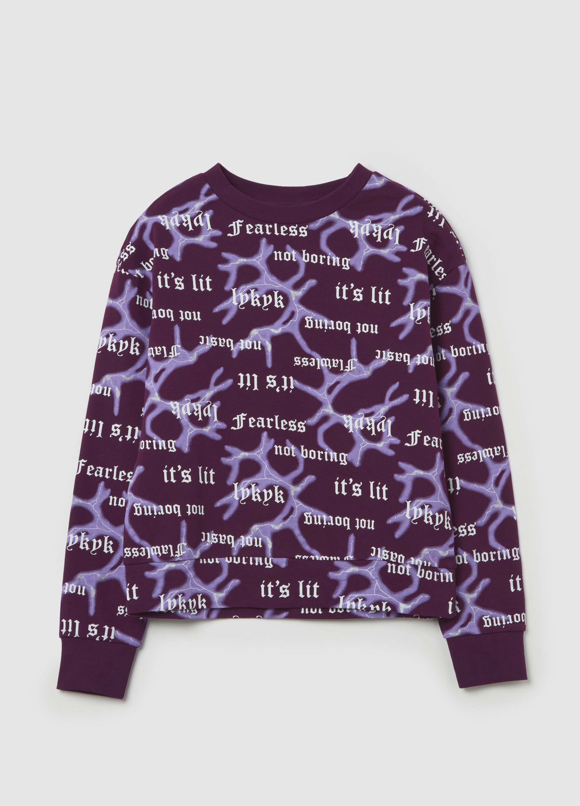 Cotton sweatshirt with gothic print for women, purple, perfect for autumn and winter. Made with high quality materials, the sweatshirt is ideal for a casual and fashionable look. The unique design and comfortable fit make it a versatile garment to wear on different occasions. Add a touch of originality to your wardrobe with this trendy sweatshirt.