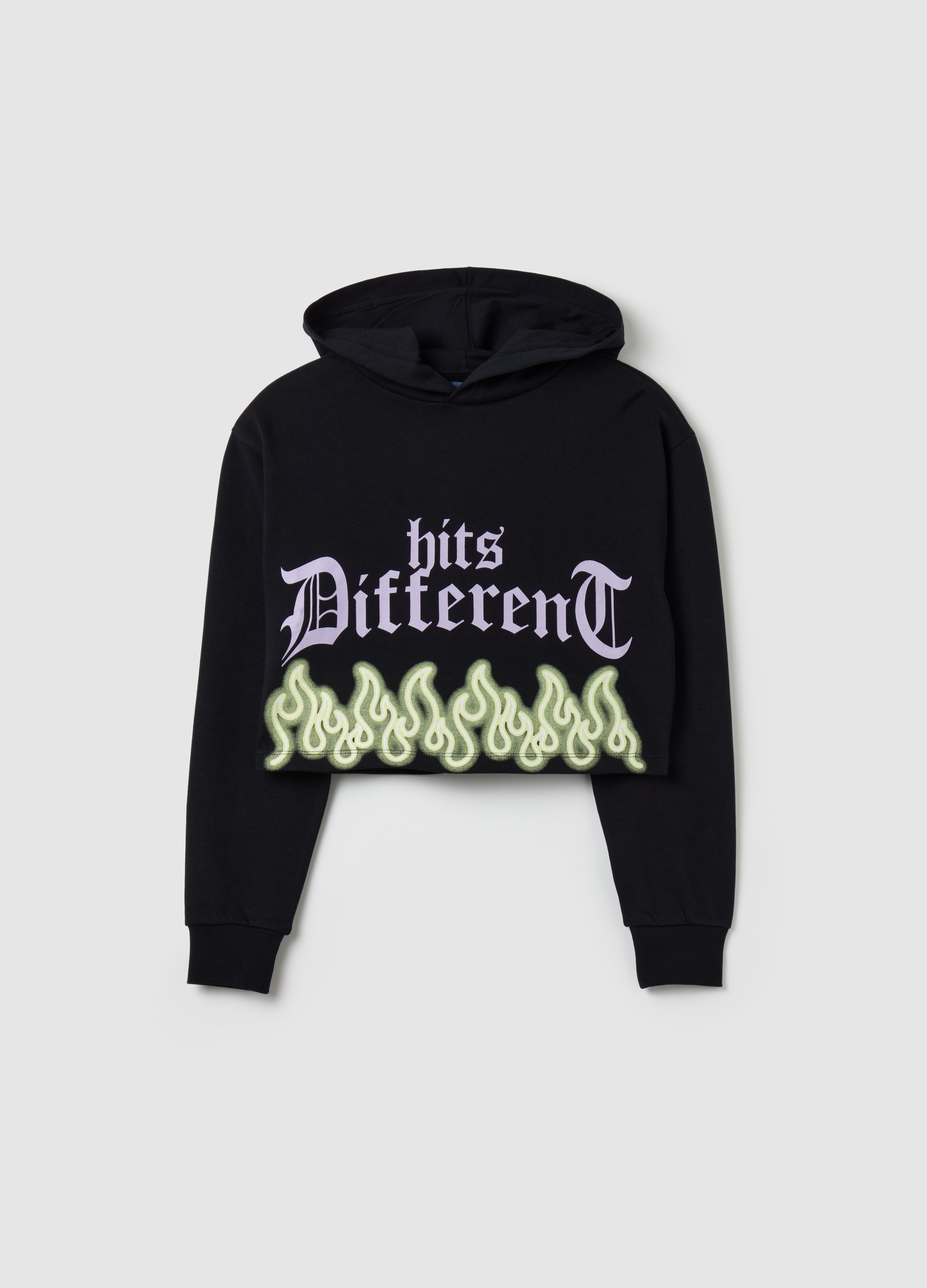 Crop sweatshirt with hood and woman print is perfect for autumn and winter. The black color makes it versatile and easy to match. Made of soft cotton to ensure comfort and warmth during cold days. An ideal casual garment for trendy and sporty look.