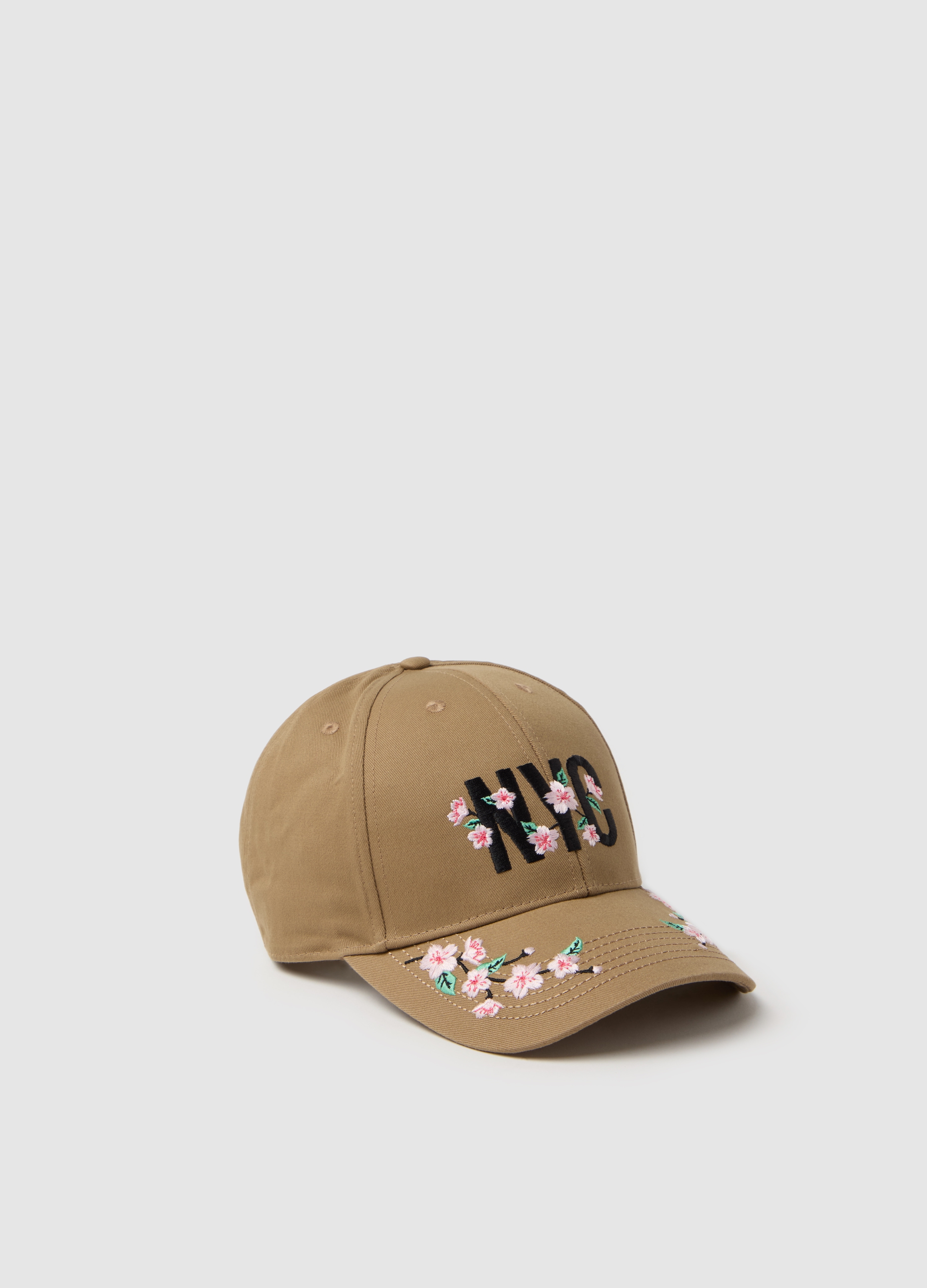 Baseball cap with embroidery NYC and flowers for woman in beige color, suitable for spring. Ideal for a casual and sporty look, perfect to match trendy and informal outfits. Made of lightweight and breathable fabric, it guarantees comfort and style on every occasion. The detail of embroidery and flowers make it an original and fashionable accessory.