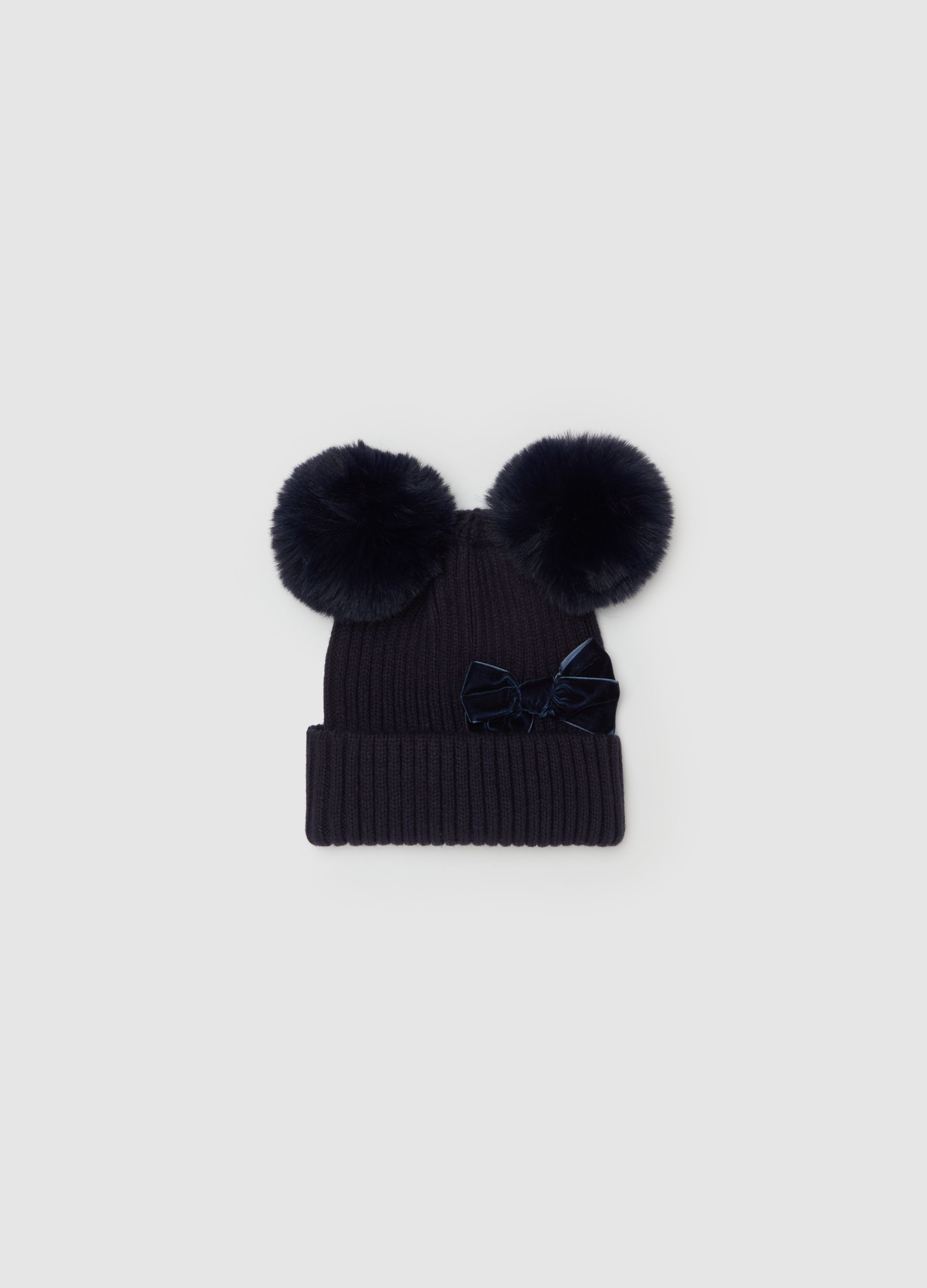 Blue knit cap with pon pon and bow, perfect for women looking for a casual and sporty look for spring. Made with high quality materials, it guarantees warmth and comfort during cooler days. Add a touch of style to your outfit with this versatile and fashionable accessory. Suitable for all informal occasions, from weekends in the countryside to walks in the city.