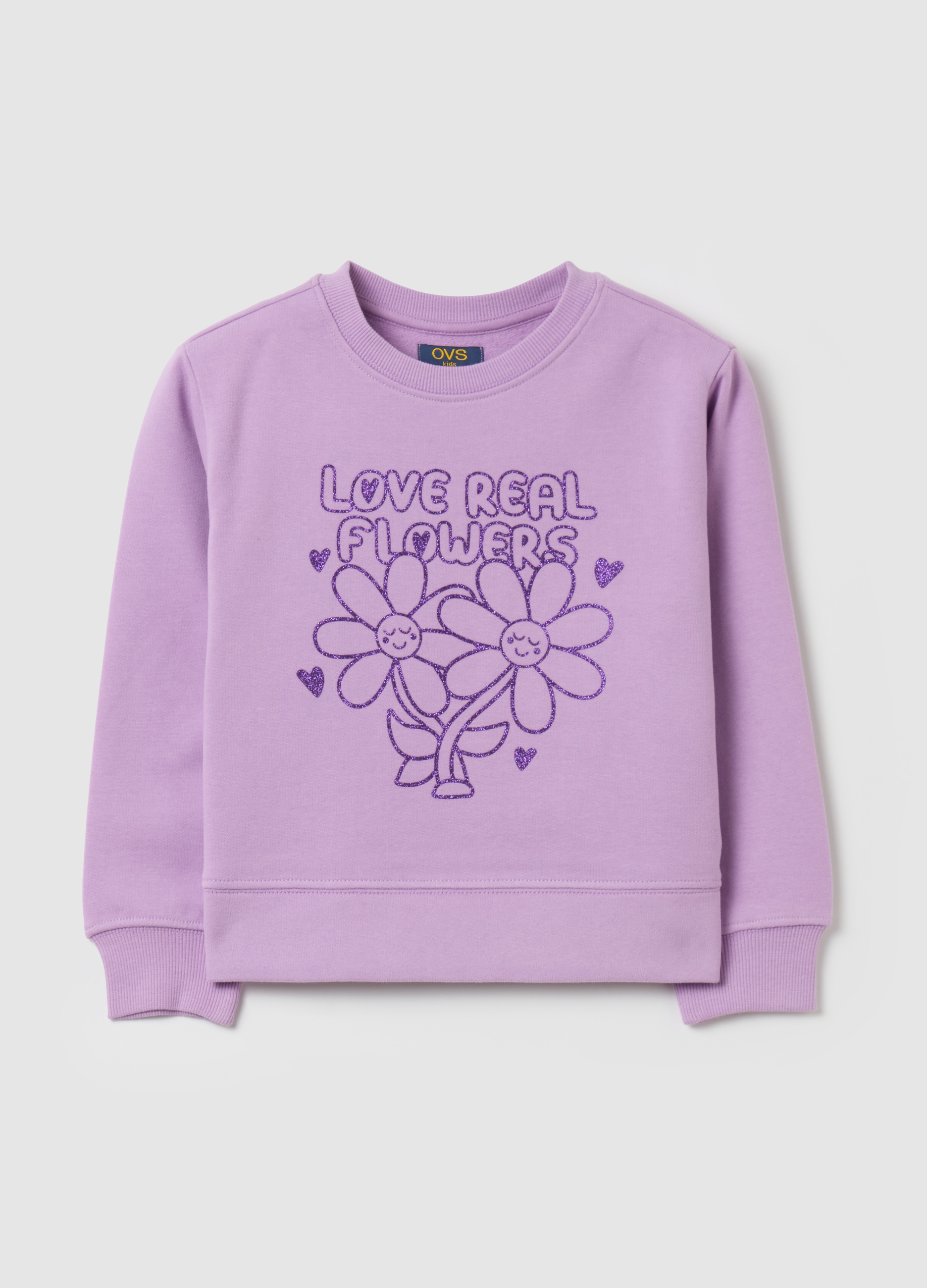 Purple cotton sweatshirt with glitter print, perfect for autumn/winter season. Made of soft and comfortable fabric, ideal for a casual and fashionable look. Suitable for any occasion, from the exit with friends to free time at home. A trendy and versatile garment to add to your wardrobe.
