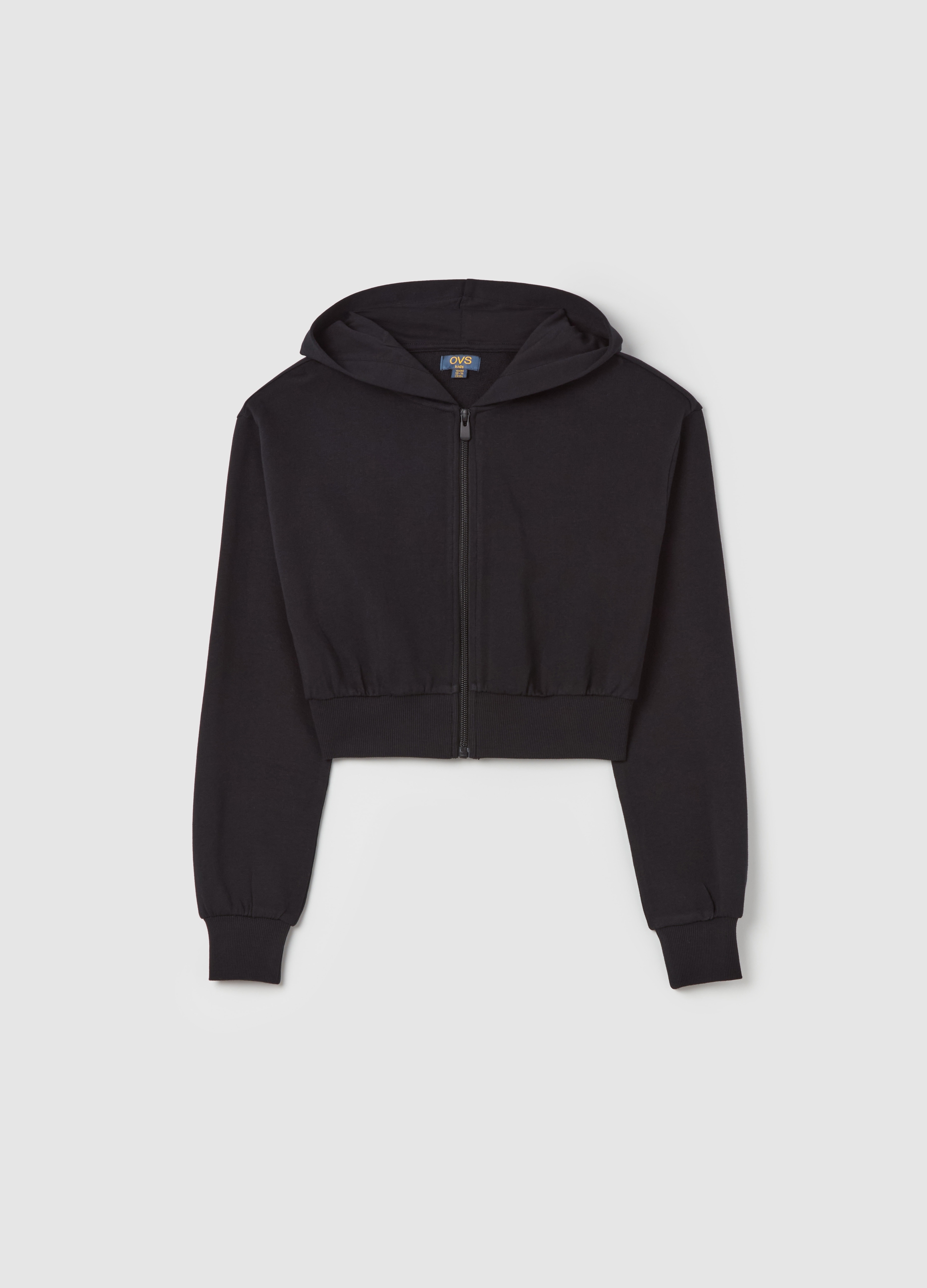 Crop sweatshirt with hood and women's zipper perfect for autumn and winter. Black, ideal for casual and sporty outfits. Made of soft fabric to ensure comfort and warmth. A versatile and trendy garment to complete your look.