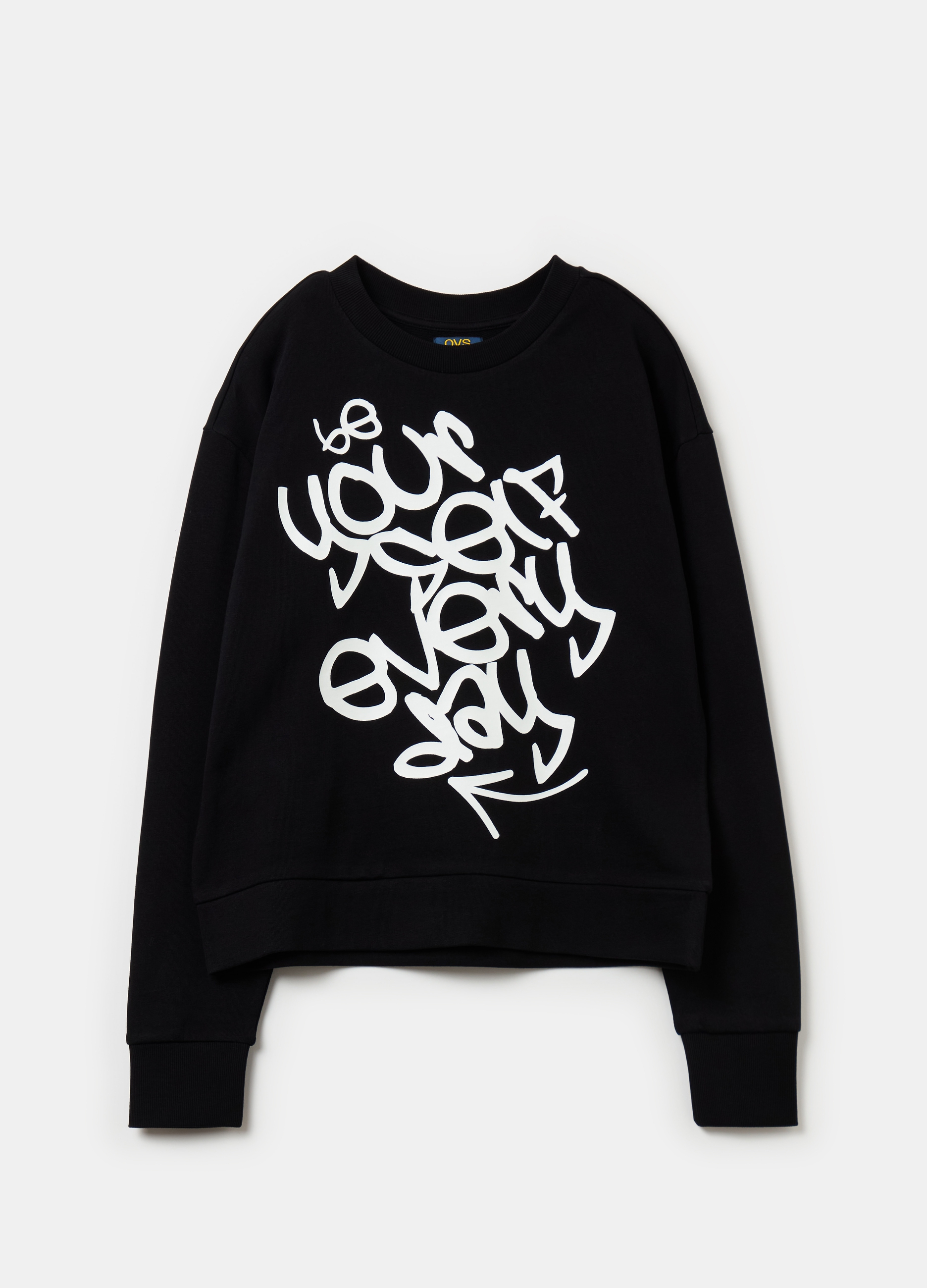 Women's casual sweatshirt in black French Terry, ideal for autumn and winter. The garment has a trendy print and a comfortable and versatile design. Perfect for a casual and fashionable look, to wear on every occasion. A must-have for your wardrobe!