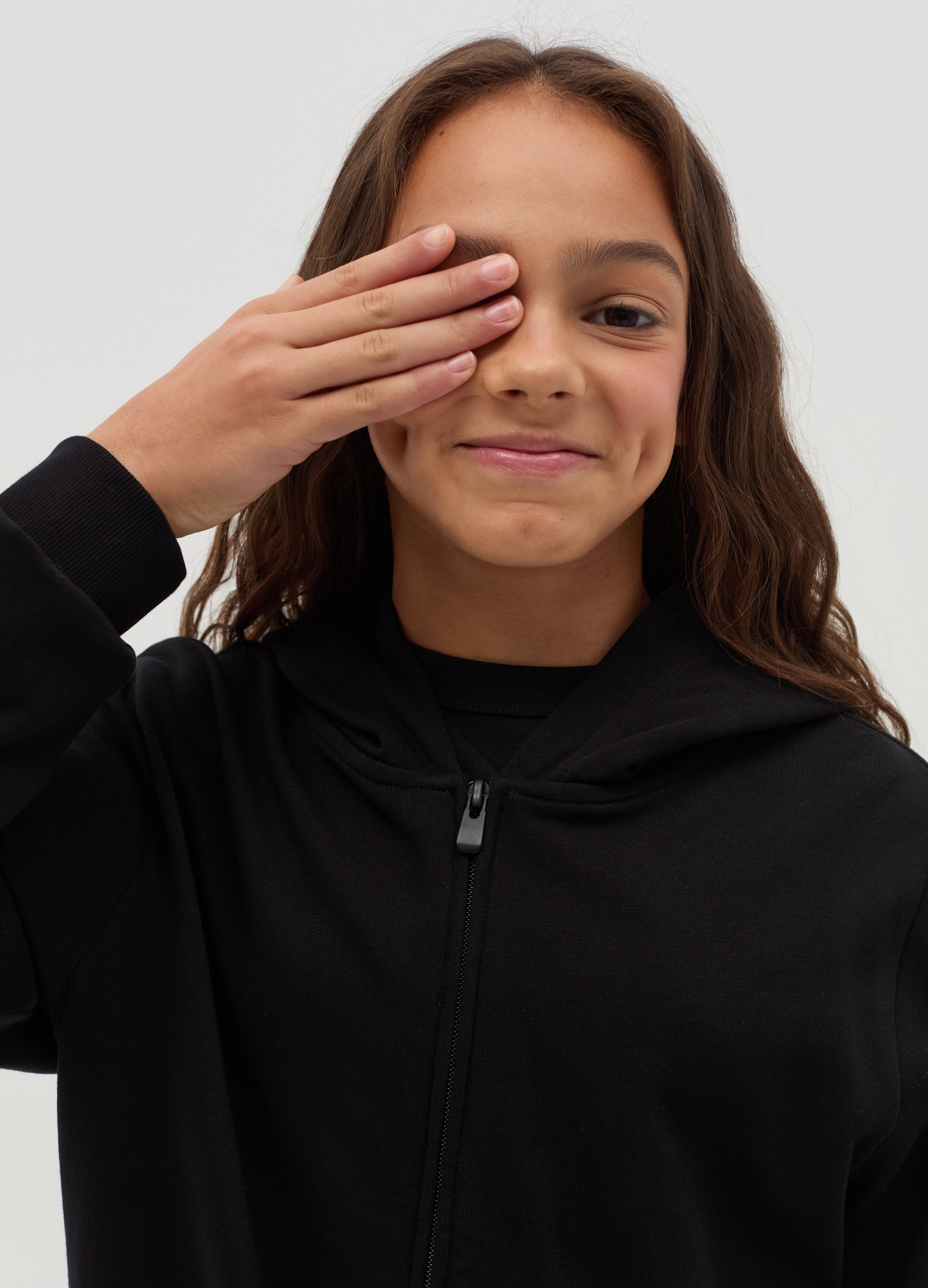 Casual Sweatshirt with full zip and hood, ideal for Autumn/Winter season. The black color makes it easy to match every outfit. Made of soft fabric to ensure comfort and warmth. Perfect for a casual and fashionable look.
