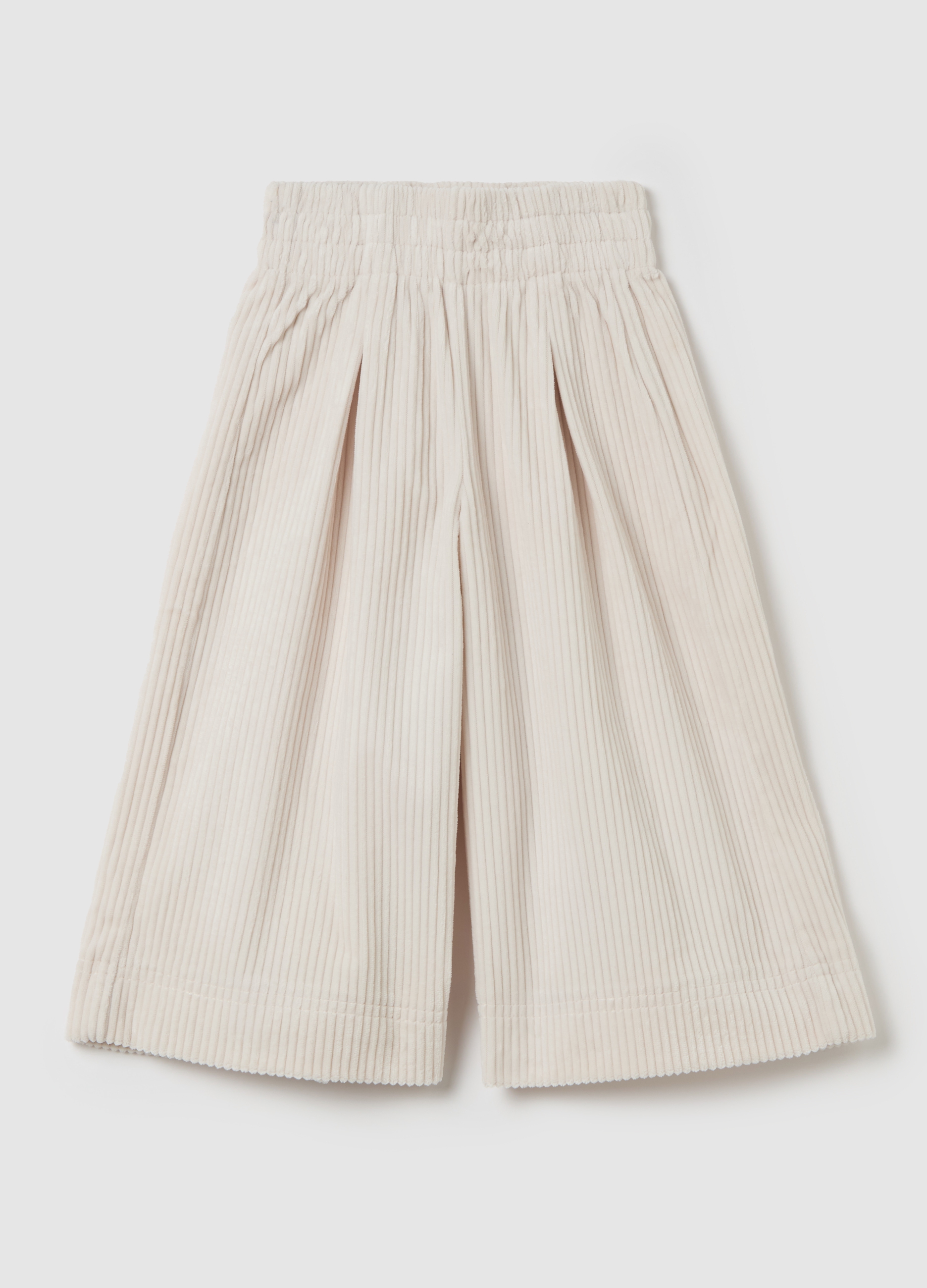 Wide leg trousers in white corduroy fabric for women, suitable for all seasons. Comfortable and sporty, ideal for a casual but fashionable look. Perfect for wear during physical activity or for an exit with friends. A versatile and trendy garment that can not miss in the wardrobe of every woman.