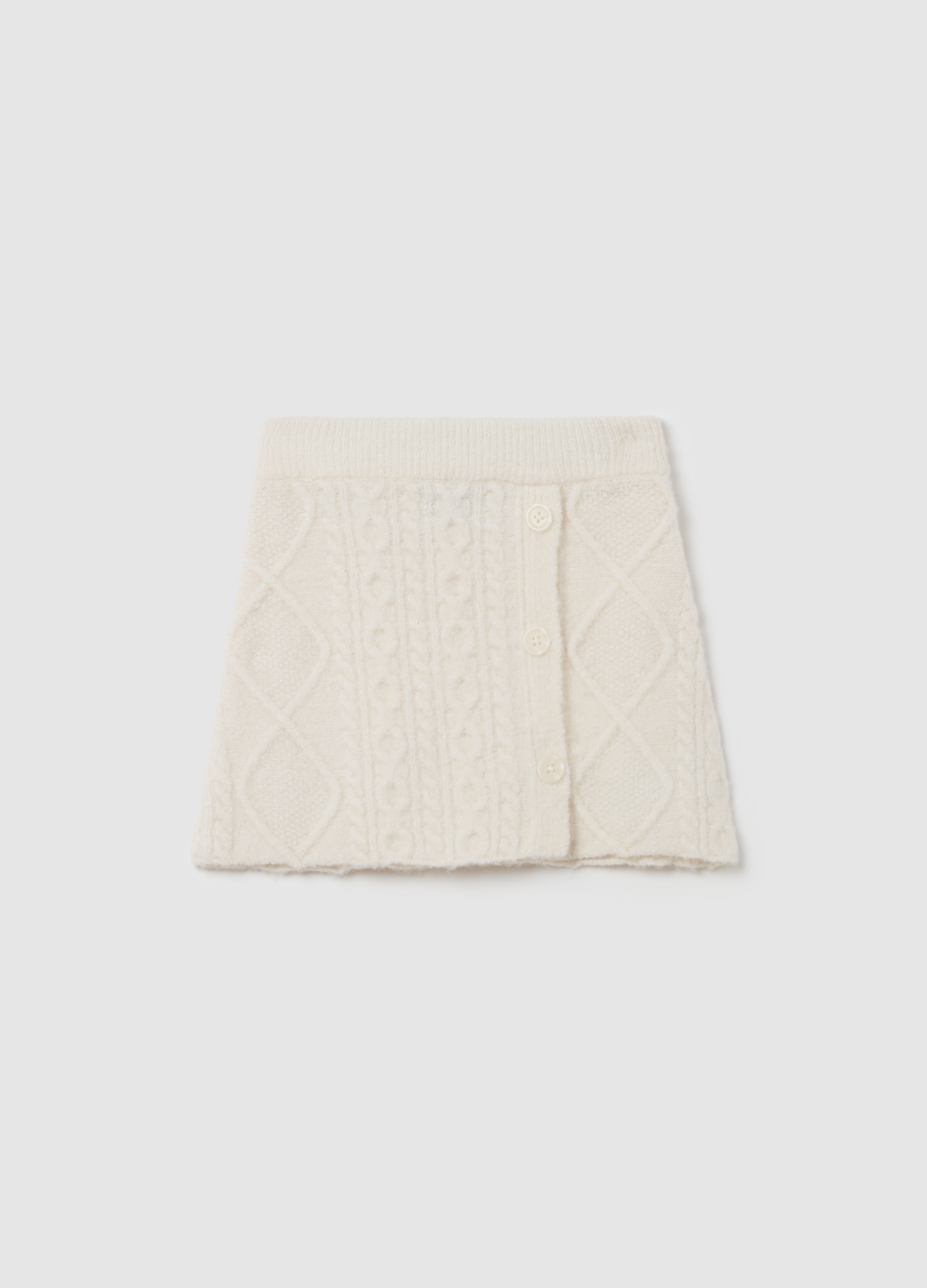This knitted miniskirt with braiding is perfect for spring/summer. White, it is ideal for creating casual and fresh outfits. Easy to match with t-shirts and sneakers for a sporty but fashionable look. A comfortable and versatile garment to have in your wardrobe.