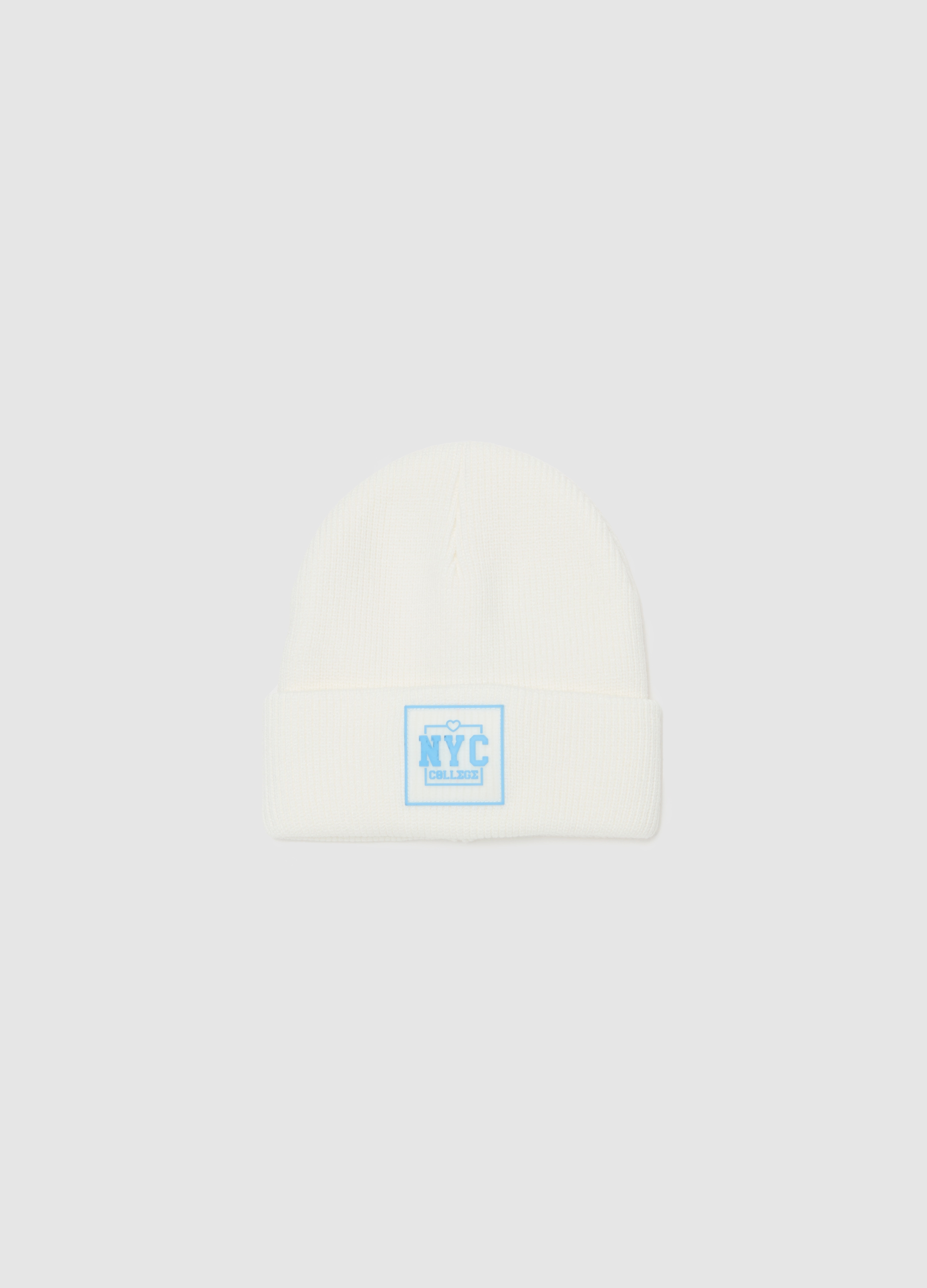 White knit cap with "NYC College" patch for woman, perfect for a casual and sporty look in spring. Made with high quality materials, this OVS cap will keep you warm with style during cool days. Add a trendy touch to your spring outfit with this versatile and fashionable accessory.