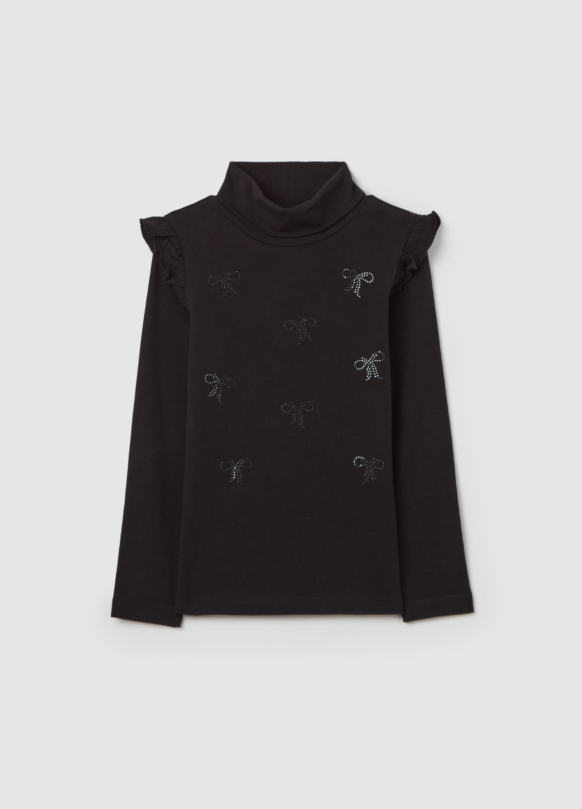 T-shirt casual suitable for all seasons, black, with high neck, rouches and rhinestone details. A versatile garment that fits perfectly with every outfit, giving a touch of elegance and femininity. Perfect to wear for a casual but refined look.
