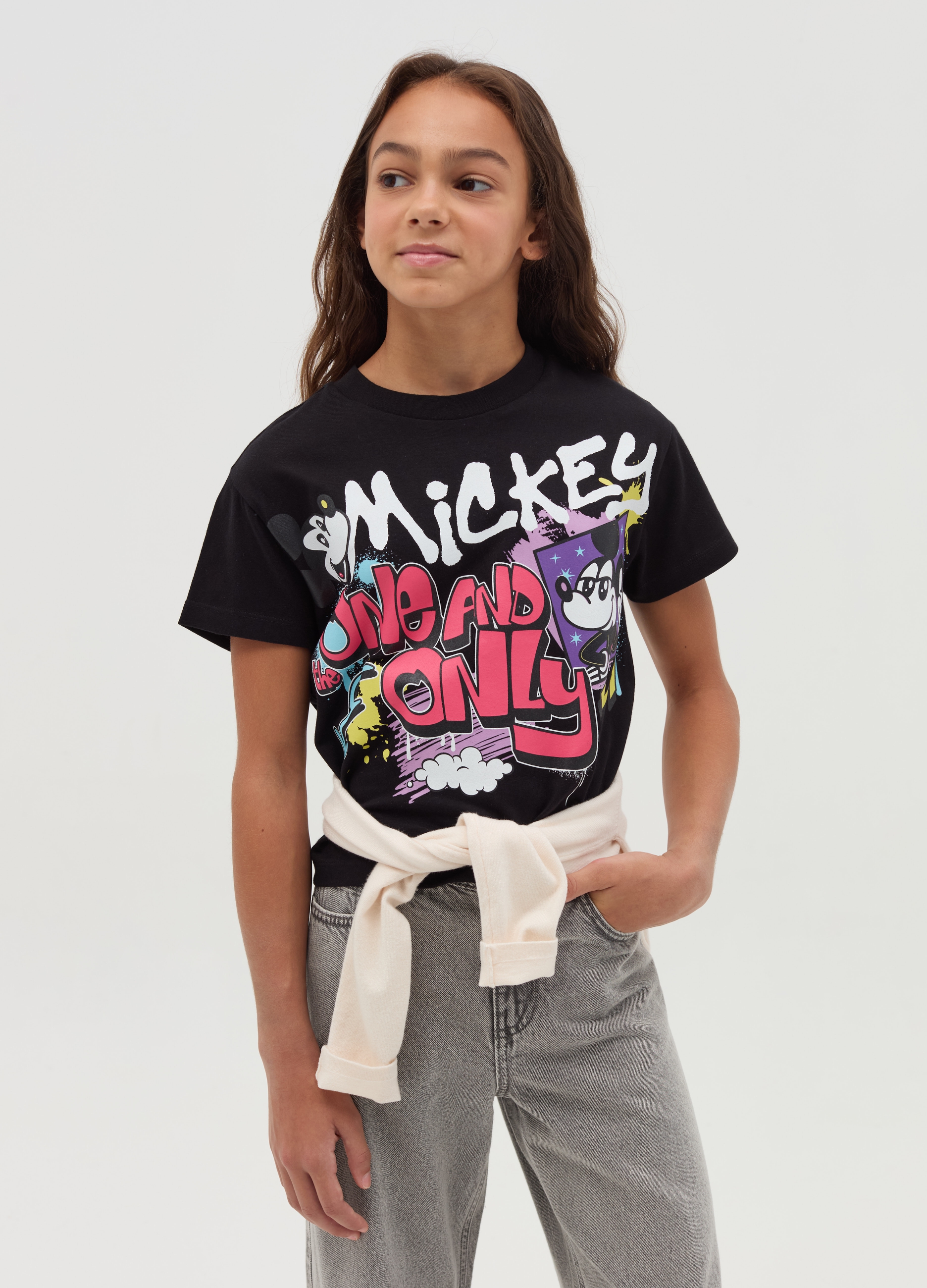 Black cotton t-shirt with Mickey Mouse print, perfect for every season. Made with high quality material, it guarantees comfort and style on every occasion. Easily combined with trousers or skirts, it is a versatile and fashionable garment. A must-have in the wardrobe of every modern woman and attentive to fashion.
