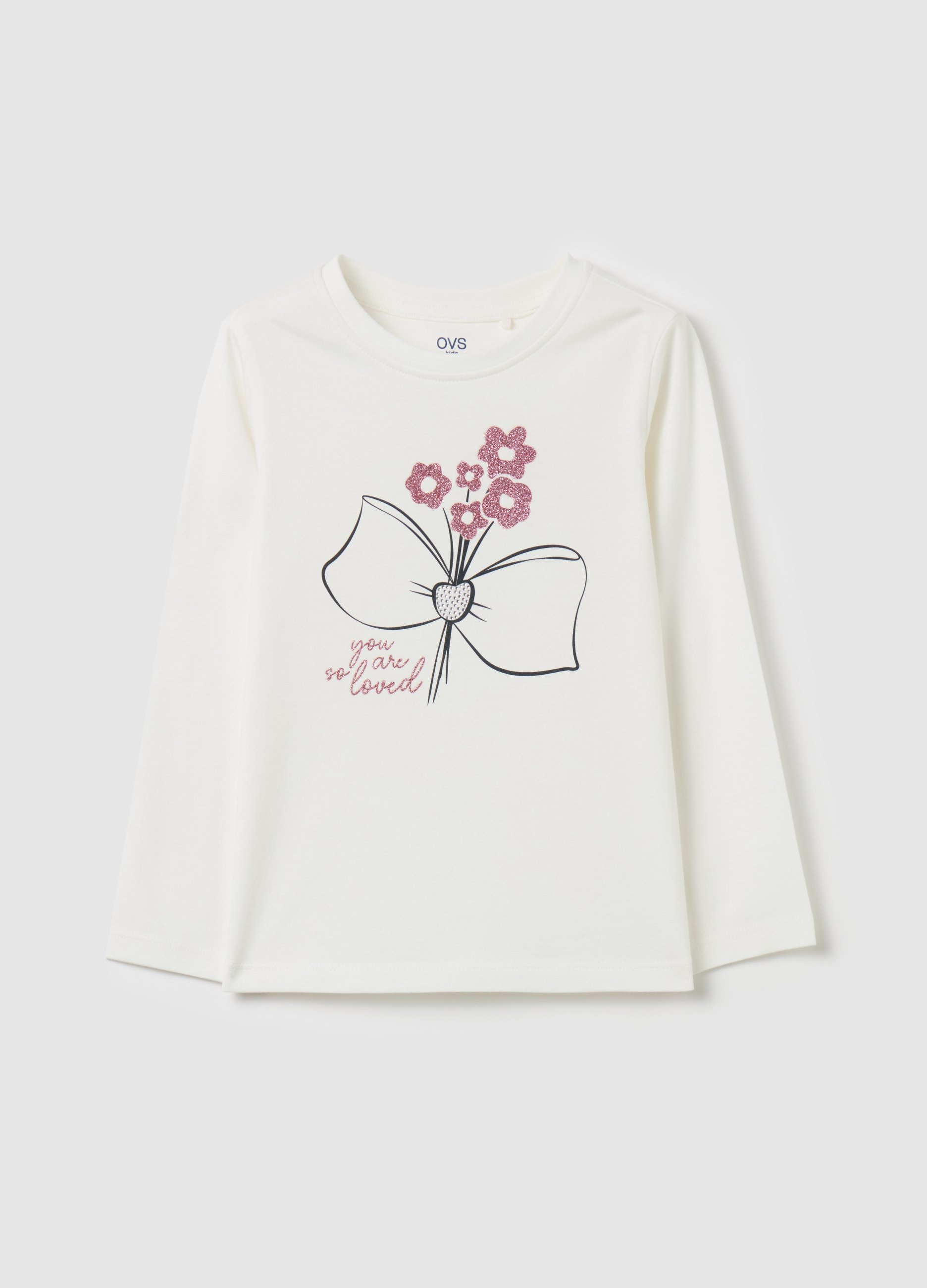 Women's casual t-shirt with long sleeves and glitter print, perfect for all seasons. Made of high quality white fabric, it offers an elegant and comfortable look. A versatile garment to wear on every occasion, from day to night. Add a touch of brilliance to your wardrobe with this OVS T-shirt!