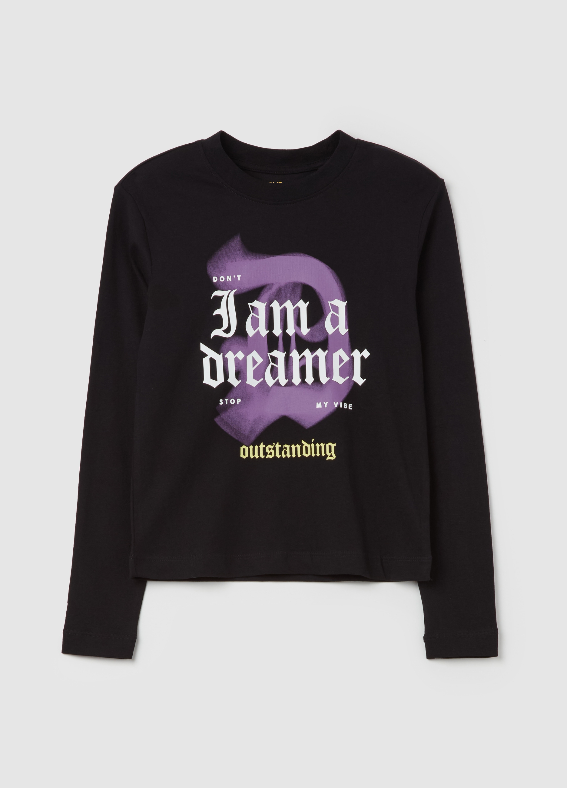 Women's casual T-shirt OVS, suitable for all seasons, black. This long sleeve shirt with print is perfect for a comfortable and fashionable look. Ideal to match with jeans and sneakers for a casual and versatile outfit. Available in size 13 14.